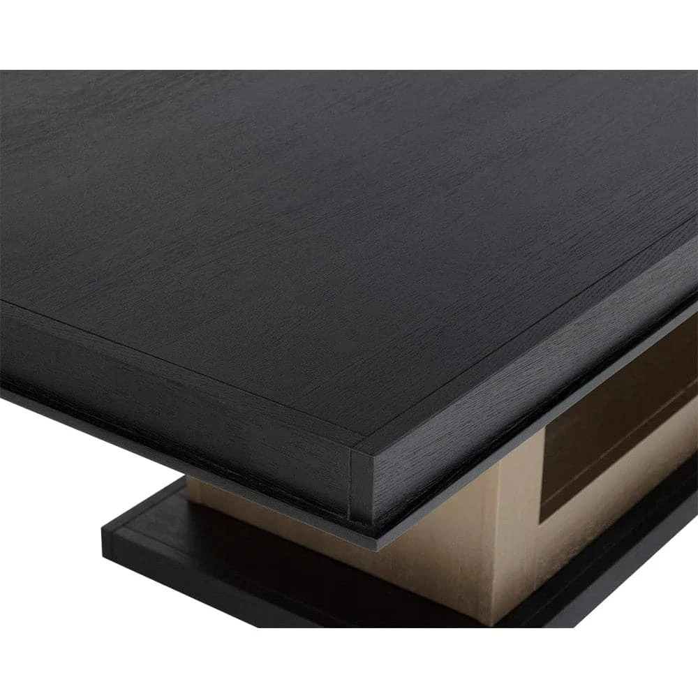 The Judson Dining Table highlights the beauty of light and dark tones. A handsome black oak wood table top and base juxtaposes with painted oak veneer legs. As wood is an organic, porous material, these pieces will contain natural variations of texture and may also exhibit fine indentations and cracks. Wood pieces will also display a disparity of colour and grain, and visible knots and burls that add to the character of each piece.