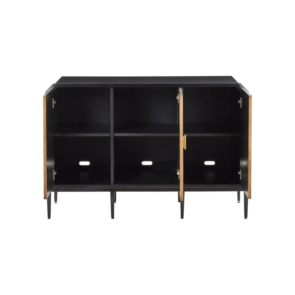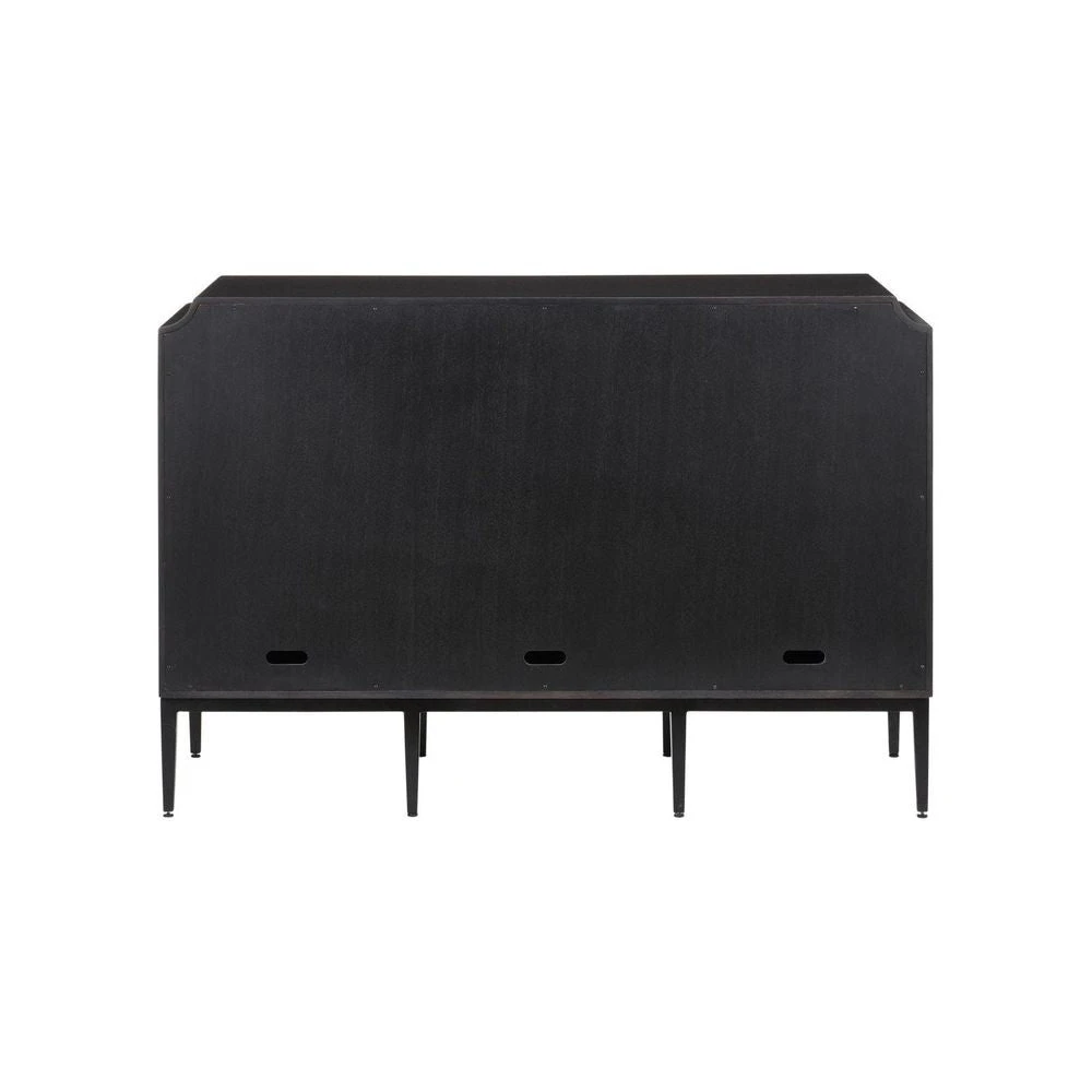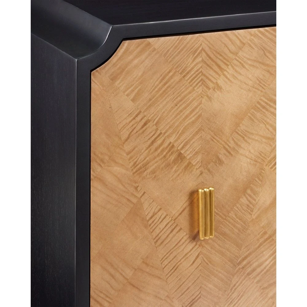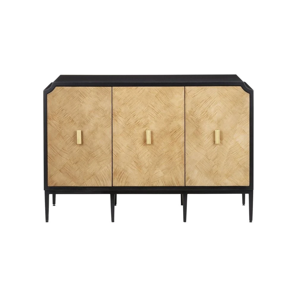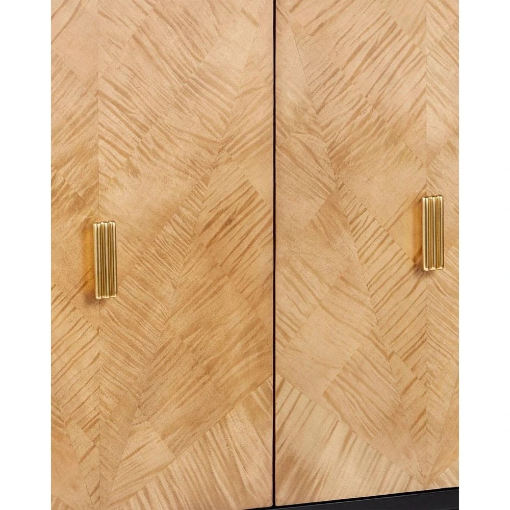 Description: The Kallista Taupe Cabinet has a taupe finish that enlivens the figured sycamore veneers on its door fronts. The wood grains bring the cabinet a hint of distressing that contrasts the rich black of the cabinet’s exterior. The door pulls are in a polished brass finish. Specialty treatments on this artful tan cabinet include soft-close doors and cord management openings.