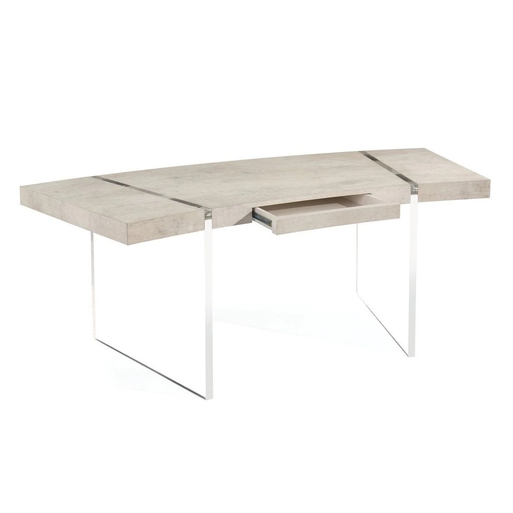 Description: A curved desk, finished in tiza gesso, has two acrylic slab supports dissecting its top.