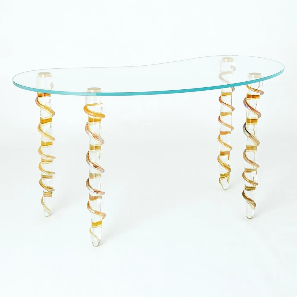 Description: Made completely from Polish art glass, our Kidney Table Glass Desk is the chic piece your home office has been missing! While made of mostly clear glass, the legs of the desk are wrapped in amber glass ribbon, adding the perfect pop of color.
