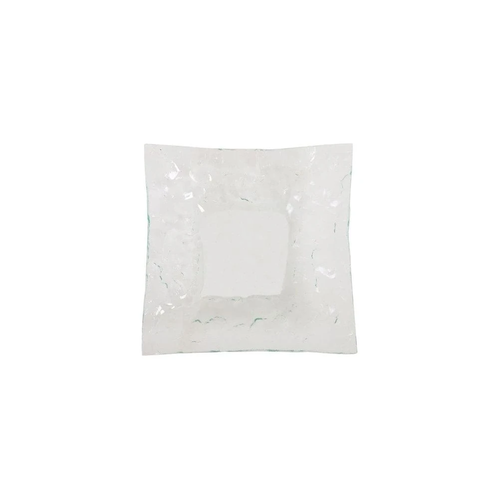 Made of glass with a turquoise sheen, the Bubble Plate is stamped with a flowing pattern that is created when molten glass is laid onto a surface covered with stones. The rocks create varying sizes of impressions that bring this decorative plate its bubbly personality. The versatility of this decorative accent is one of its charms: place it on a large kitchen island and fill it with dried artichokes or line several of them on a dining room table to form a lovely centerpiece. A design aspect of note is how the fluted edges were created by the bumpy surface of the stones, which is the perfect representation of the Phillips Collection ethos: modern organic. We offer a number of furnishings in the Bubble Glass family of products.