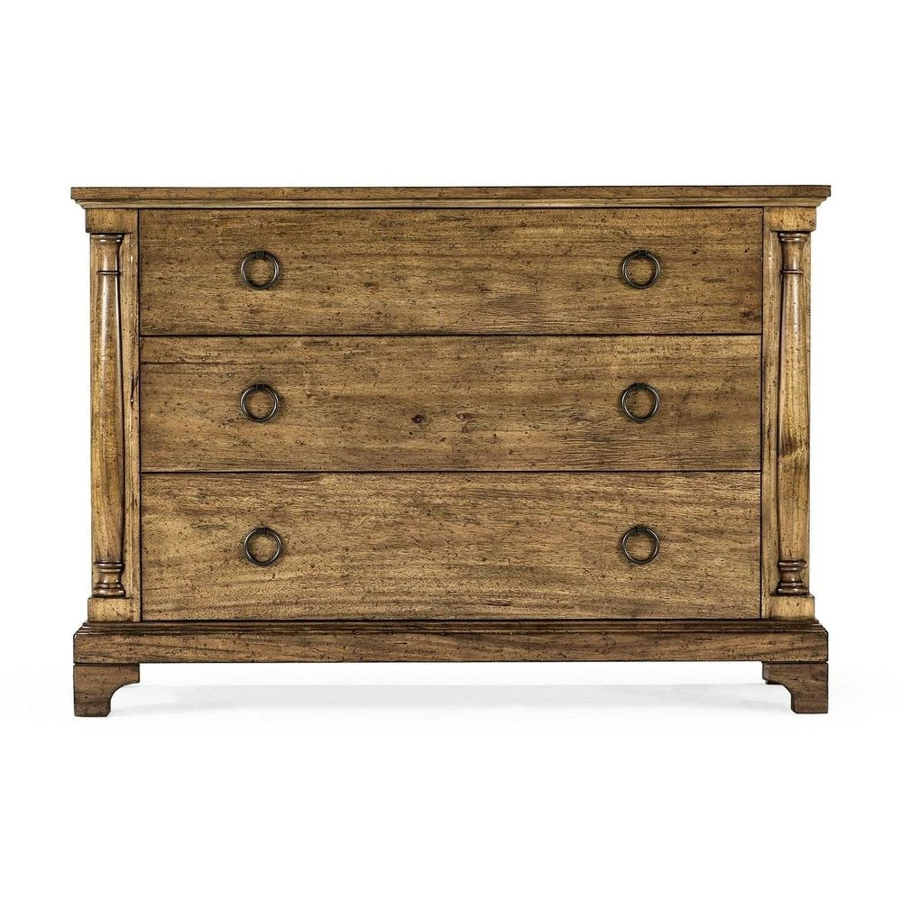 Antique dark grey, Country walnut, Medium driftwood chest of drawers on a stepped pedestal base with brass ring handles.