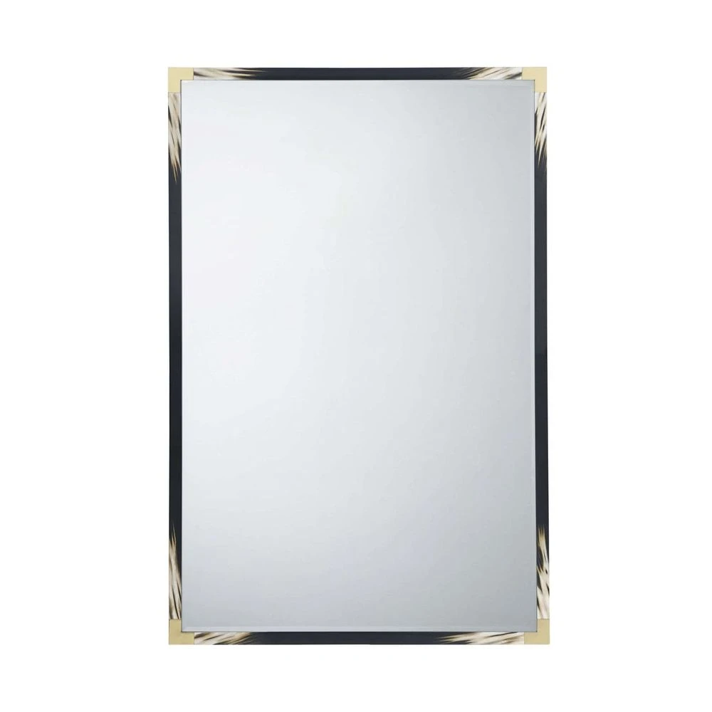 A black lacquered and faux horn mirror, the rectangular top with brass edged corners, enclosing a bevelled edge plate.