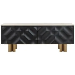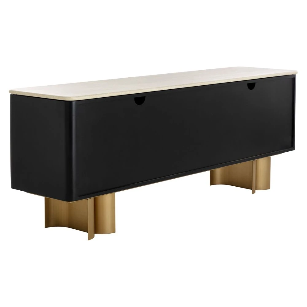 Description: Bold design and mixed materials establish the modern presence of the Lautrec Sideboard. Crafted with stainless steel and a stunning cream marble top, the Lautrec features captivating textural forms on the front sliding doors. Supported with uniquely curved legs in an antique brass finish.