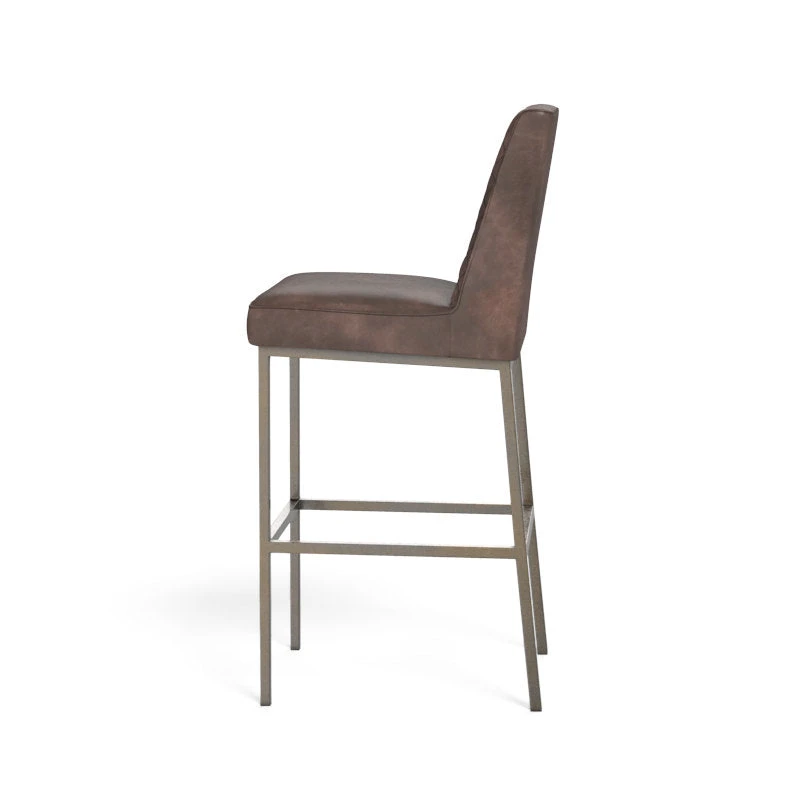 Transform transitional spaces with this barstool from our 5West collection. Stocked in light and dark grey fabric with diamond stitching on the interior seat back and an antique brass frame steel frame. Suitable for various dining, kitchen and bar spaces of all sizes.