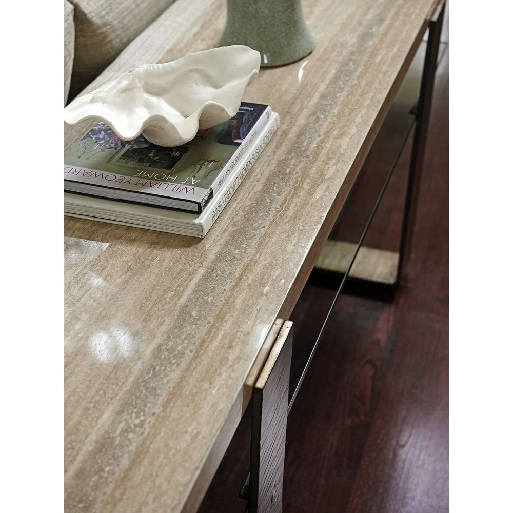 Crafted from cathedral cherry veneers and mahogany solids, design in Laurel Canyon feature strong architectural lines in a mocha finish with soft gray undertones. Metal bases are finished in hand-burnished silver leaf, with silver travertine tops.