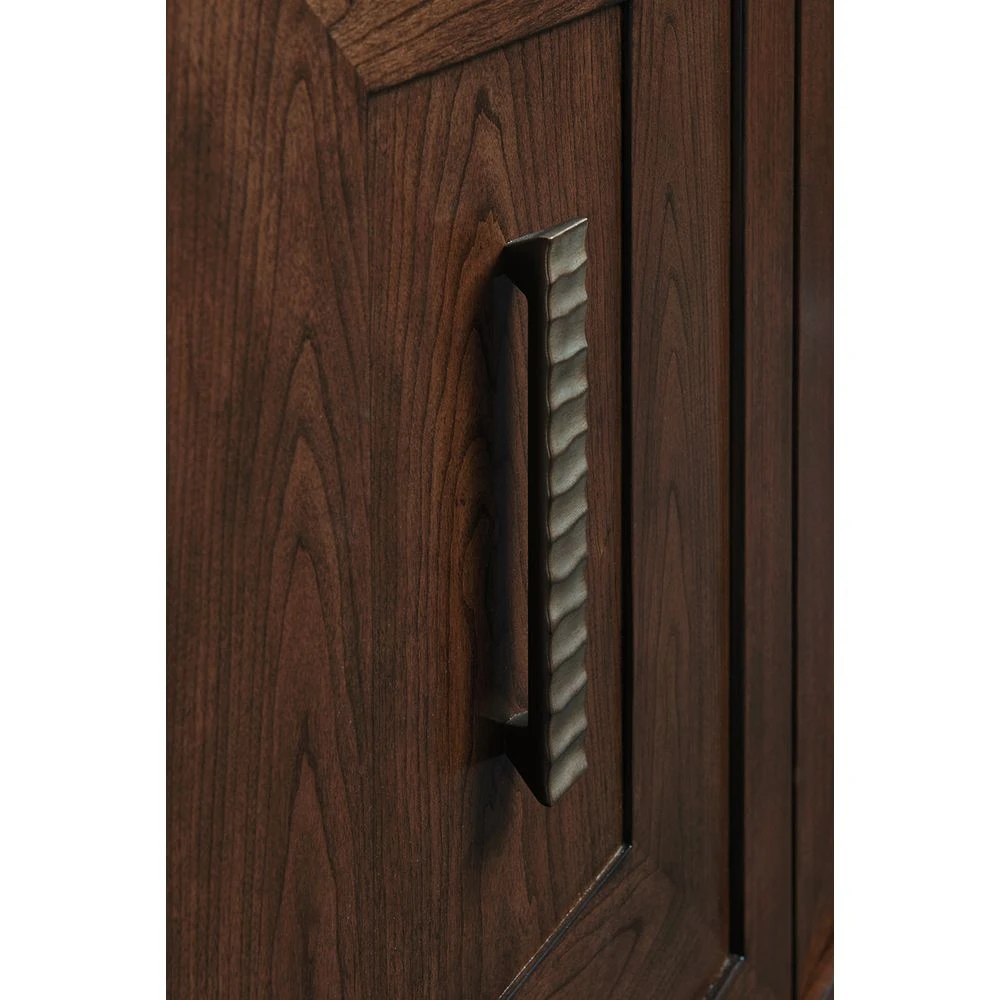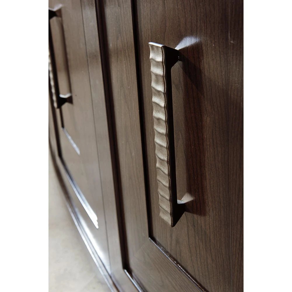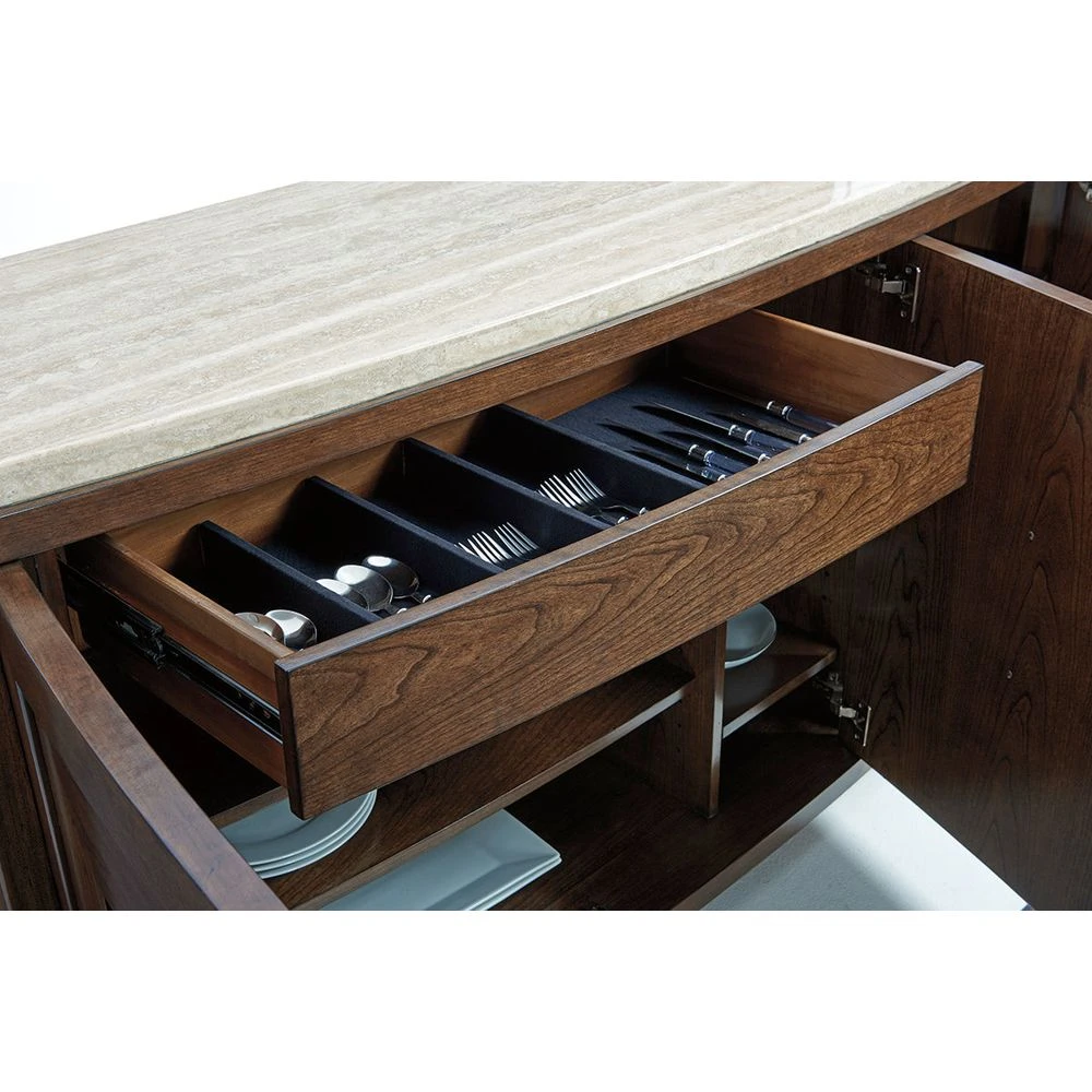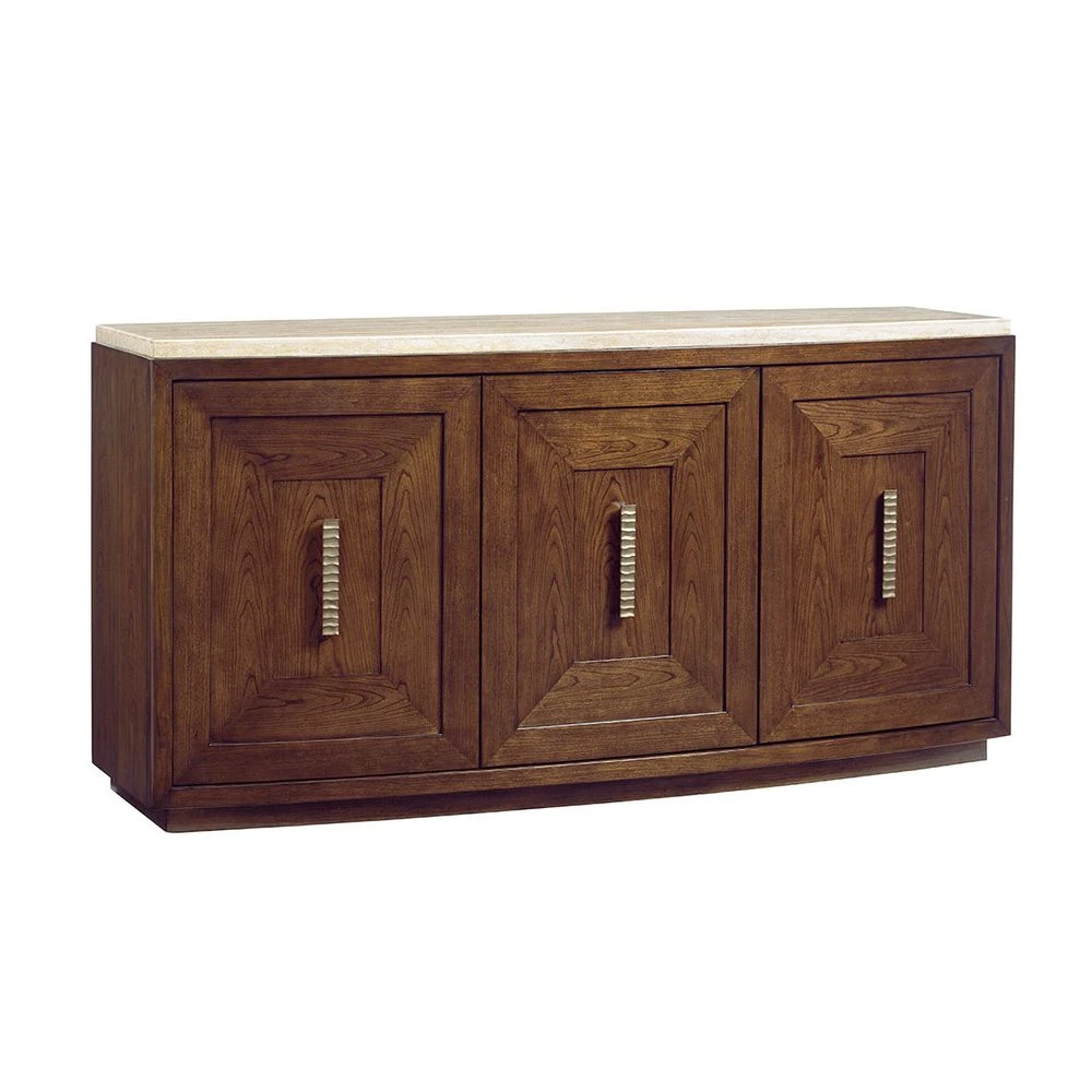 Crafted from cathedral cherry veneers and mahogany solids, design in Laurel Canyon feature strong architectural lines in a mocha finish with soft gray undertones. Metal bases are finished in hand-burnished silver leaf, with silver travertine tops.