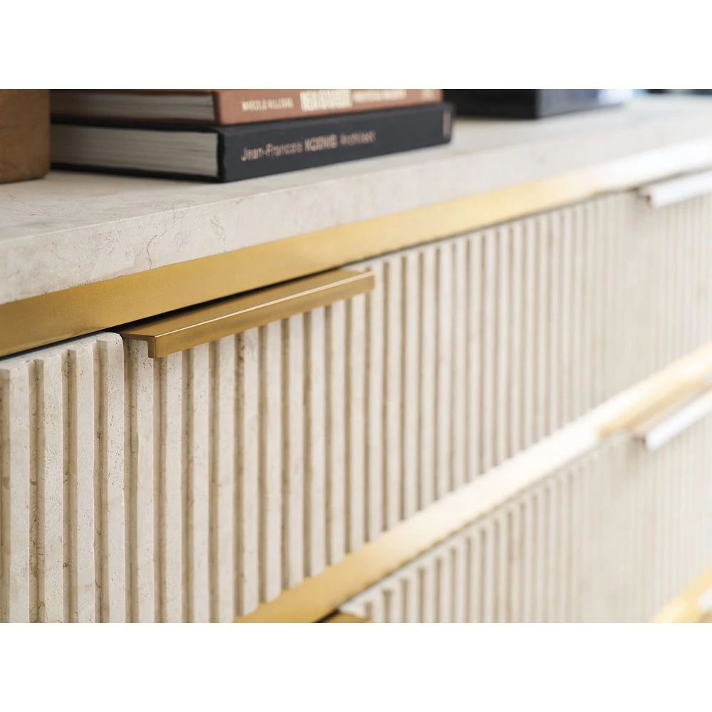 Marketing Copy: Offering a fresh take on casual contemporary living, La Costa features elegant curves, fluted detailing, and a fusion of materials like Anticato marble, honed limestone and metal accents in a satin gold finish. Designs incorporate touches of Mid-Century styling for a sophisticated yet approachable interpretation of luxury living.