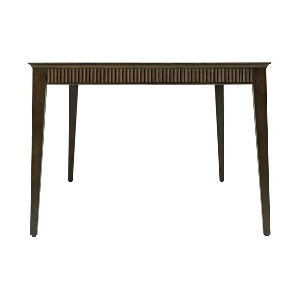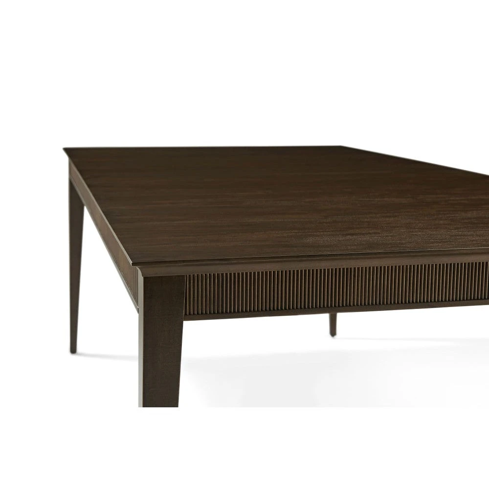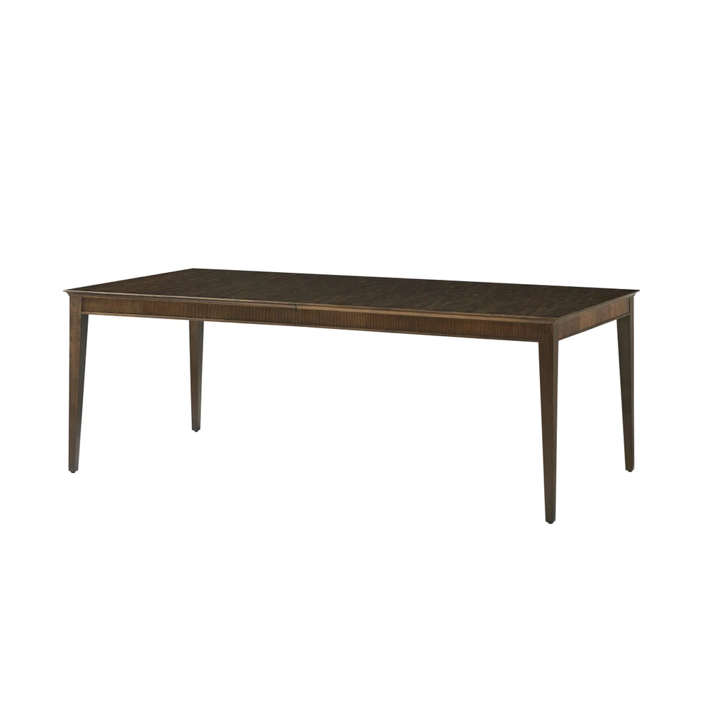 The Lido Rectangular Dining Table, crafted in a Prima Vera in our dark Bistre finish, features a reeded apron set upon sleek tapered legs. Includes two leaf inserts and two additional legs for a more luxurious dining experience.