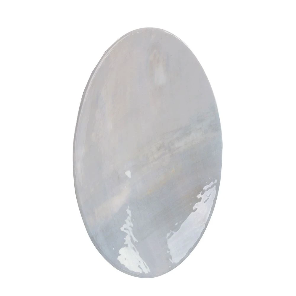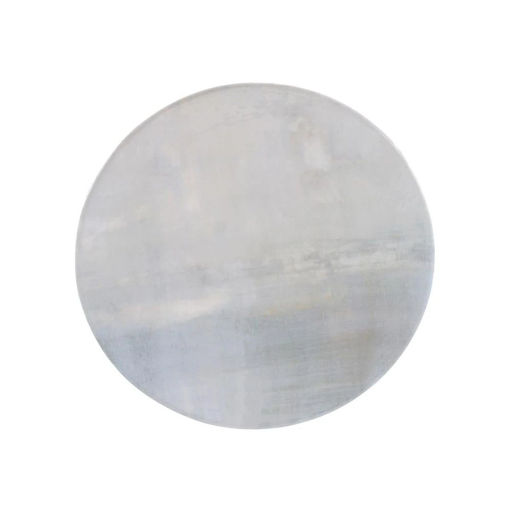 A metal charger, backed with silver leaf, with an image by artist Linda Benson-Cobb. It can be hung on the wall or placed on a table.