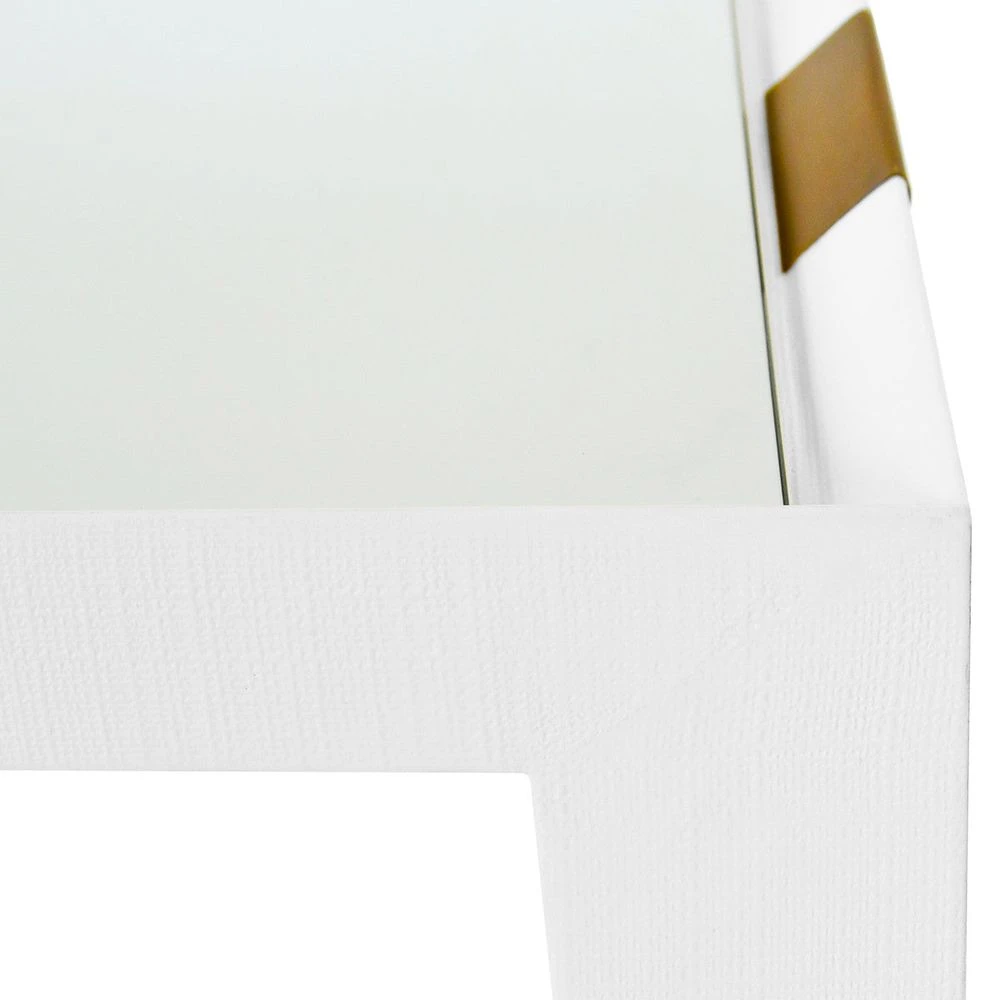 Description: FLARED BAR CART WITH ANTIQUE BRASS DETAIL IN WHITE TEXTURED LINEN