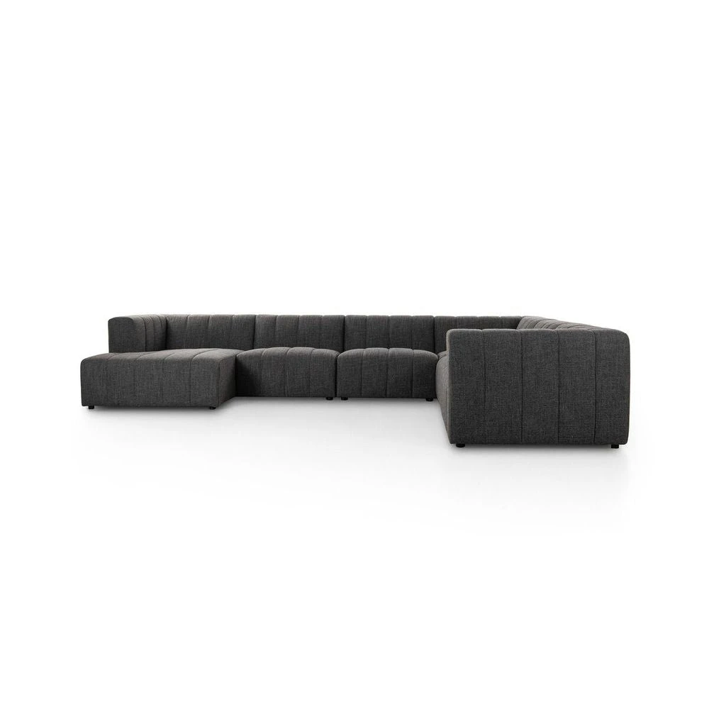 Wide, vertical channeling and low styling speak to the Italian influence behind this spacious six-piece sectional. Upholstered in a charcoal wool blend that’s textural and comfortable at once.