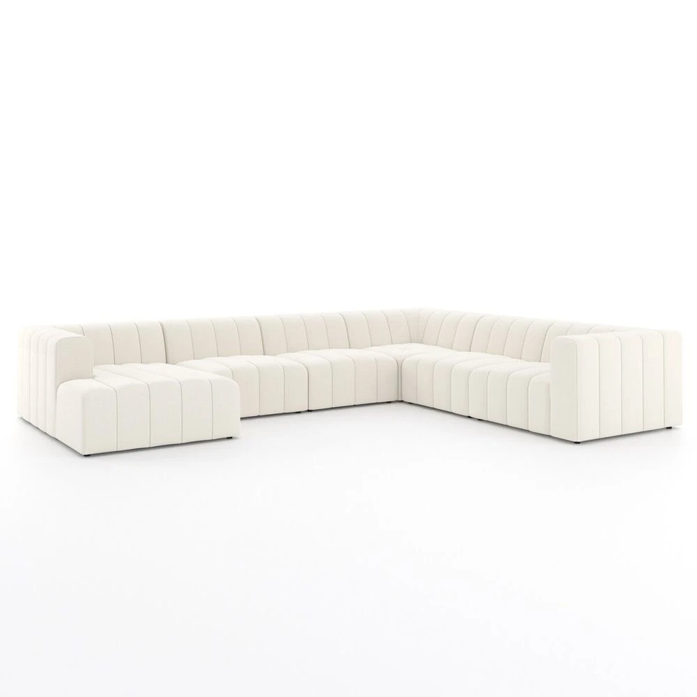 The sensible six-piece sectional meets modern Italian styling, with a matching left arm facing chaise, wide channeling and oversize arms. Neutral cream covering awes in any space. Performance fabrics are specially created to withstand spills, stains, high traffic and wear, ensuring long-term comfort and unmatched durability.