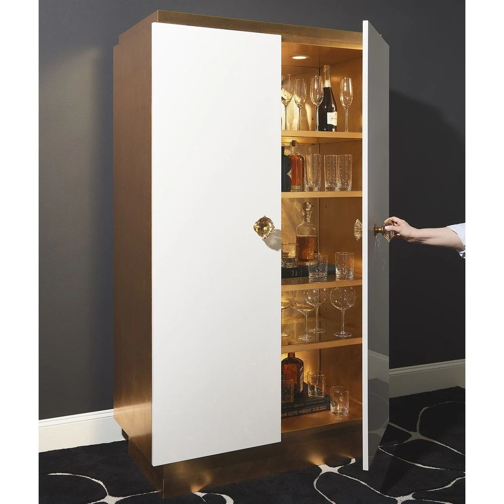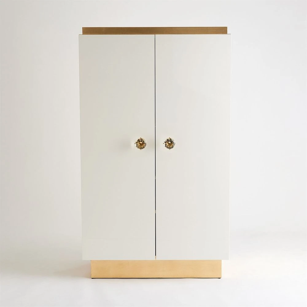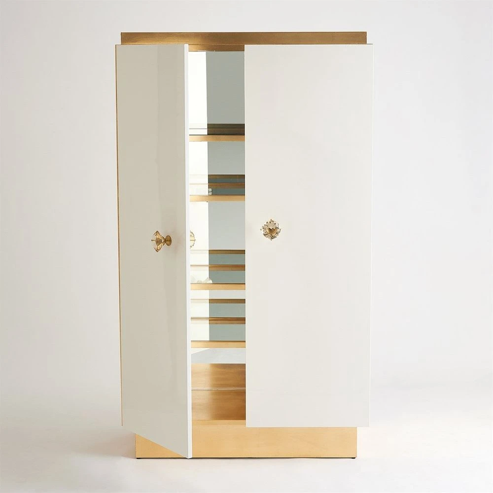 Description: So much to love about the London Tall Cabinet! This elegant and quietly sophisticated cabinet designed by Julia Buckingham for Global Views, makes a dramatic entry into any space into which it is introduced. This cabinet features lacquered door fronts with gold leafed base and sides. The interior is mirrored with glass shelves and lights at the top. Part of a coordinated collection which includes a credenza and nightstand.