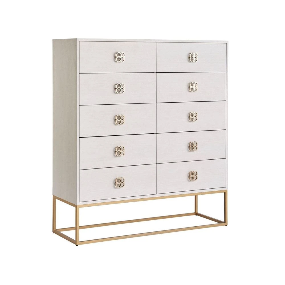 Exquisite and poised, the Peony Drawer Chest is crafted with ten spacious drawers that are accented with butterfly-inspired soft gold hardware and encased in a fresh Alabaster finish. A soft gold metal base completes this playful yet elegant storage piece.