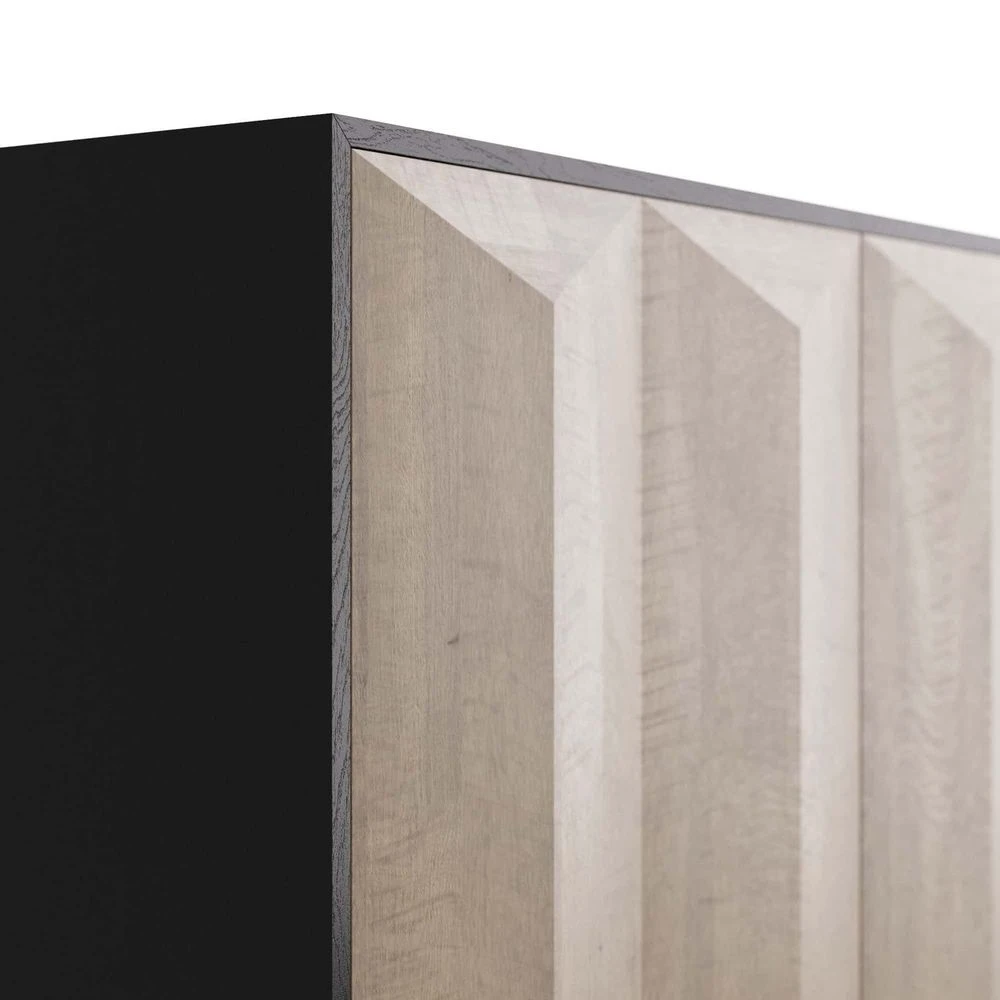 The façade of the Massimo credenza takes its inspiration from the texture of modernist cast-concrete buildings. Constructed in a combination of chamois gray eucalyptus veneer and ebony oak veneer, the three-section sideboard is fitted with adjustable interior shelves and push-latch hardware. Finishes will vary.