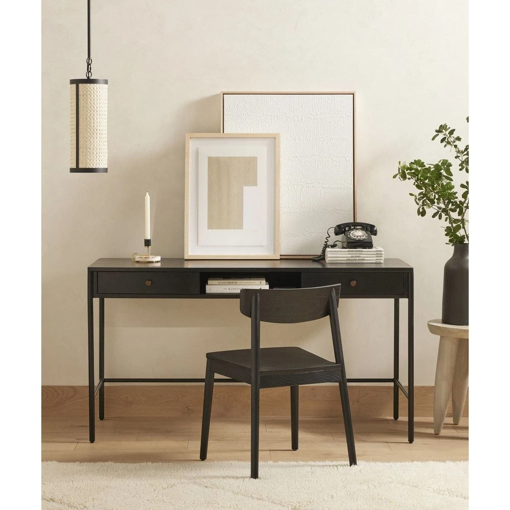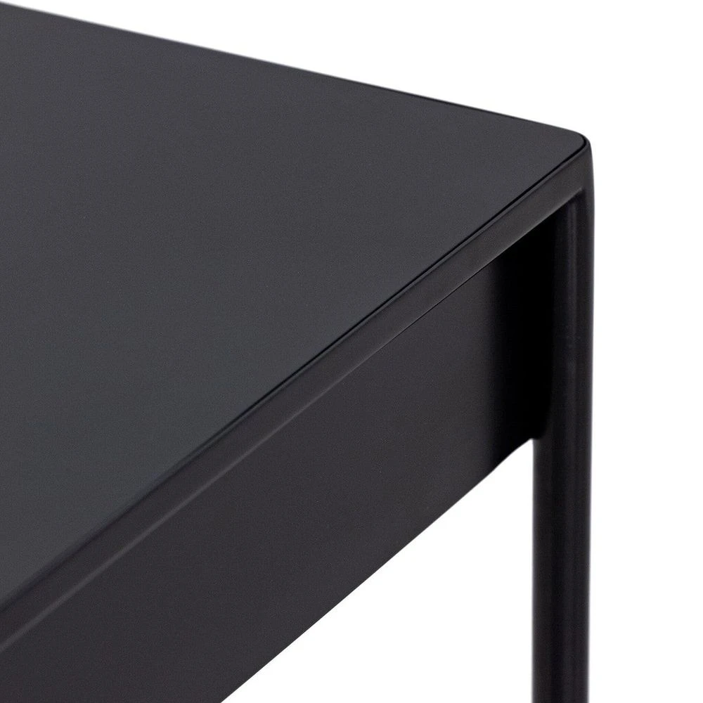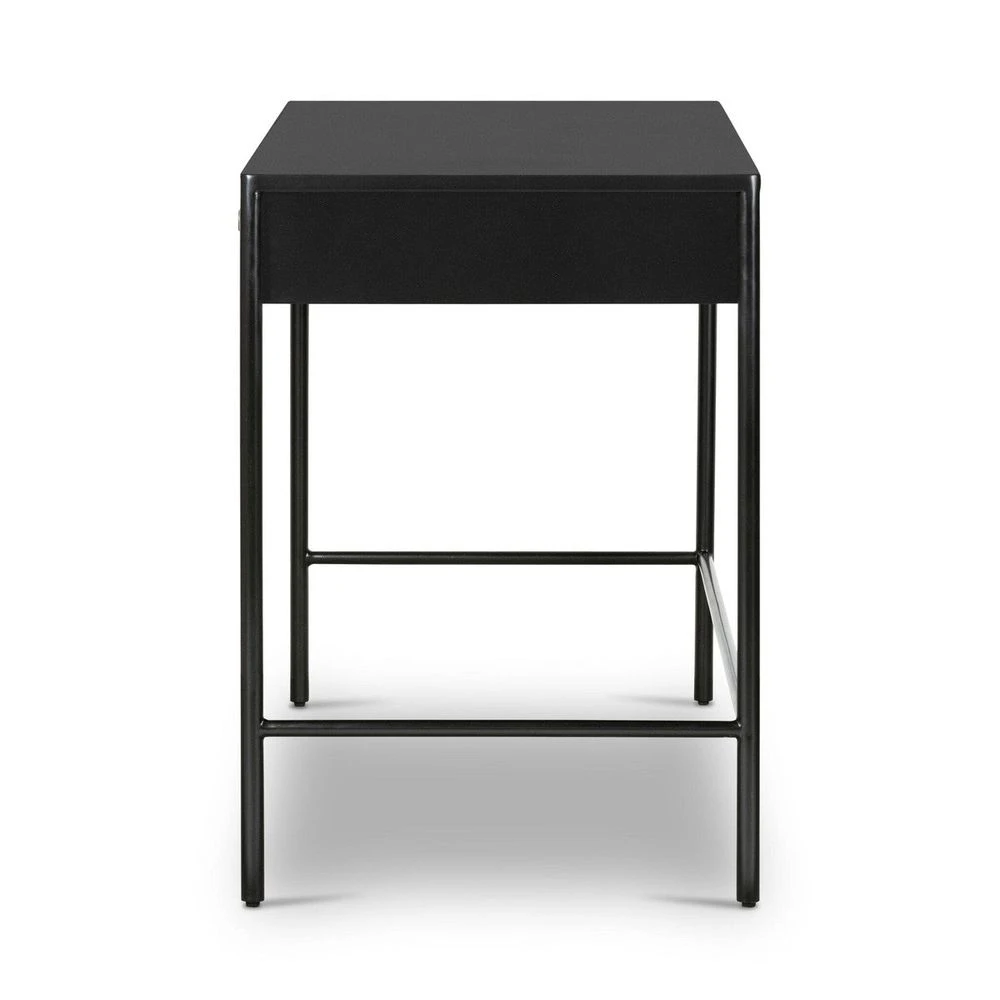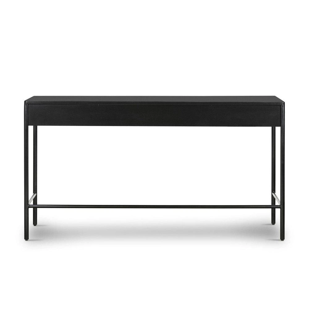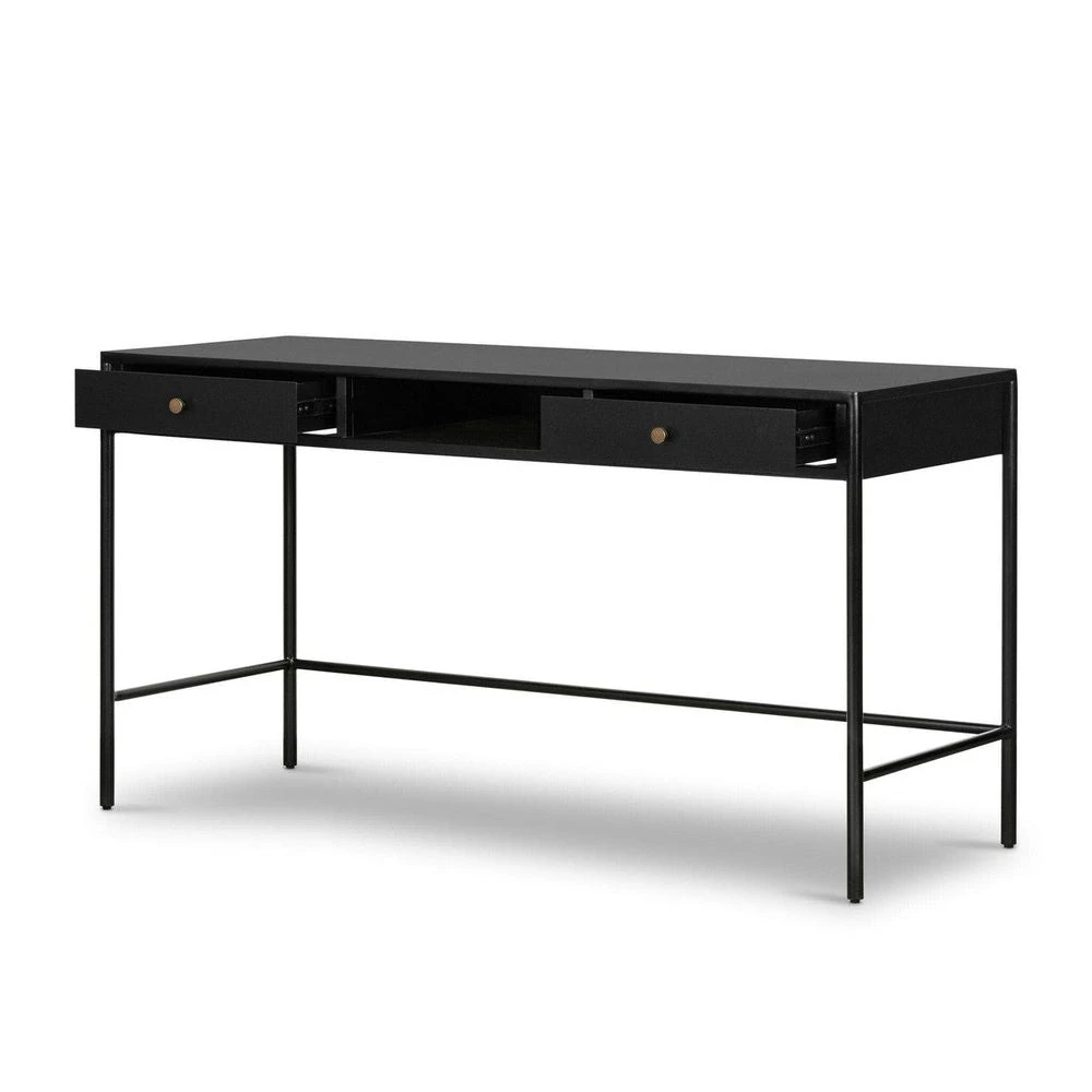 - Description: Slim and streamlined, with a touch of industrial edge. Made from black-finished iron with bronze-finished hardware and dual drawers for convenient storage.