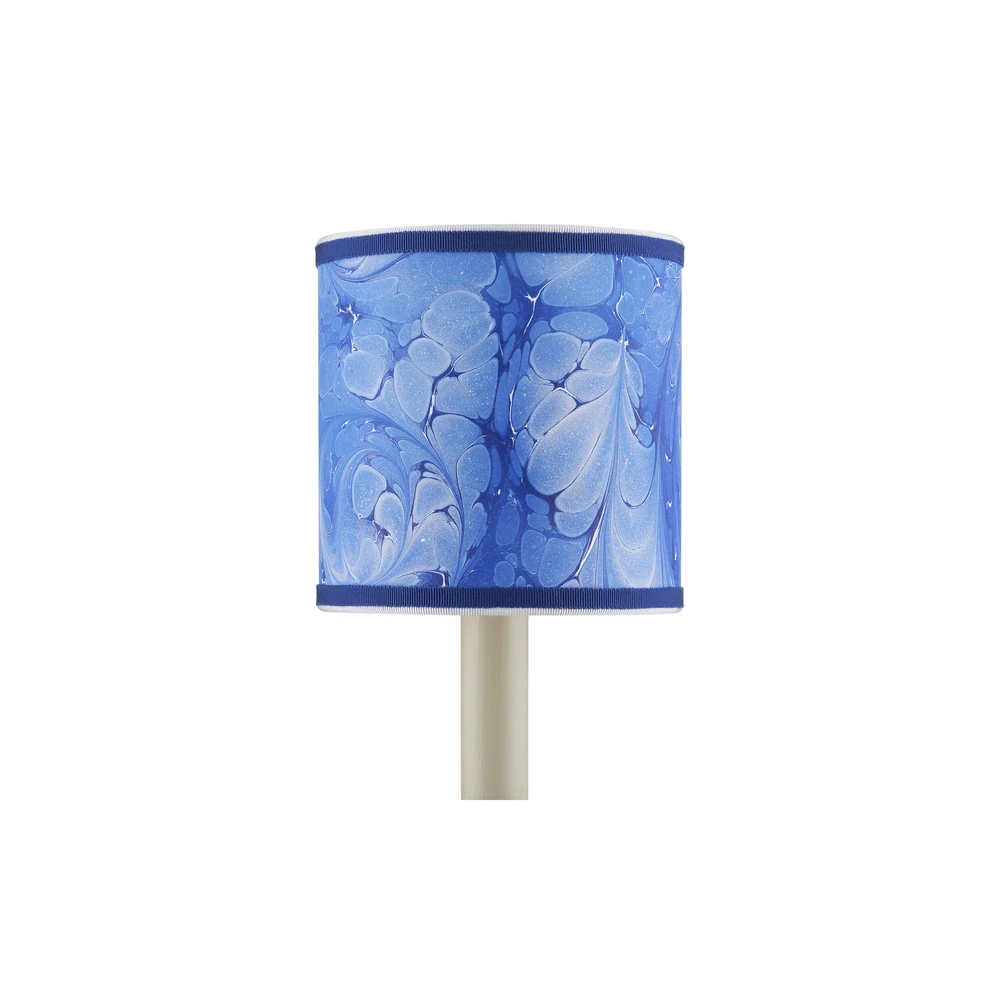 Description: Petite shades are an easy way to bring added style to a space while also introducing color and texture, particularly when they are made from artisanal marbleized paper and ornamented with two layers of grosgrain ribbon in different hues. The saturation of the colors on the handmade tapered and cylindrical shades for chandeliers and wall sconces is achieved by a New England atelier. Patterns will vary because they are created during a very organic process that makes any surface treated to marbleizing so special. There are both vivid and pastel patterns in this collection, as you can see from this swirling bright blue version of the drum shade. Top Diameter: 5″ Bottom Diameter: 5″ Height: 5″