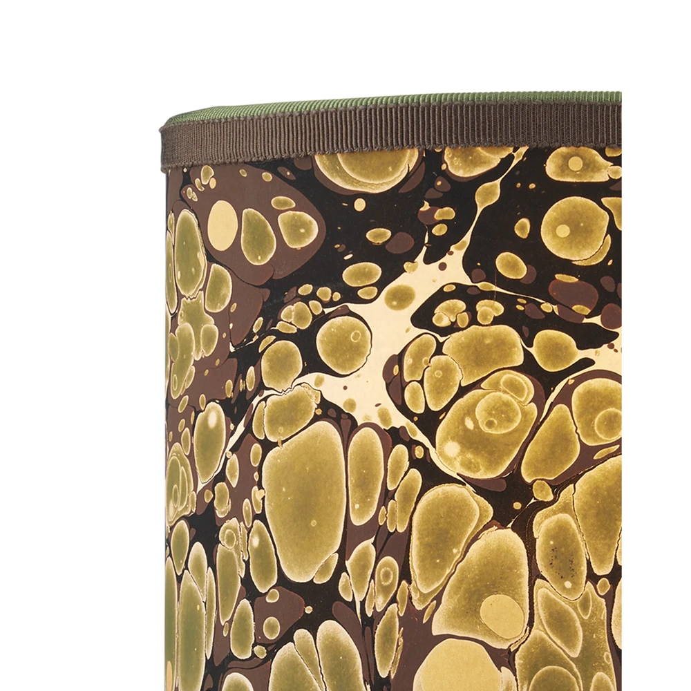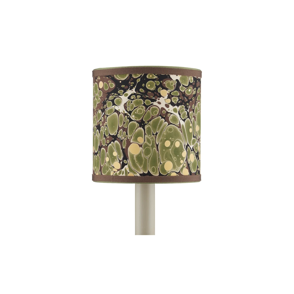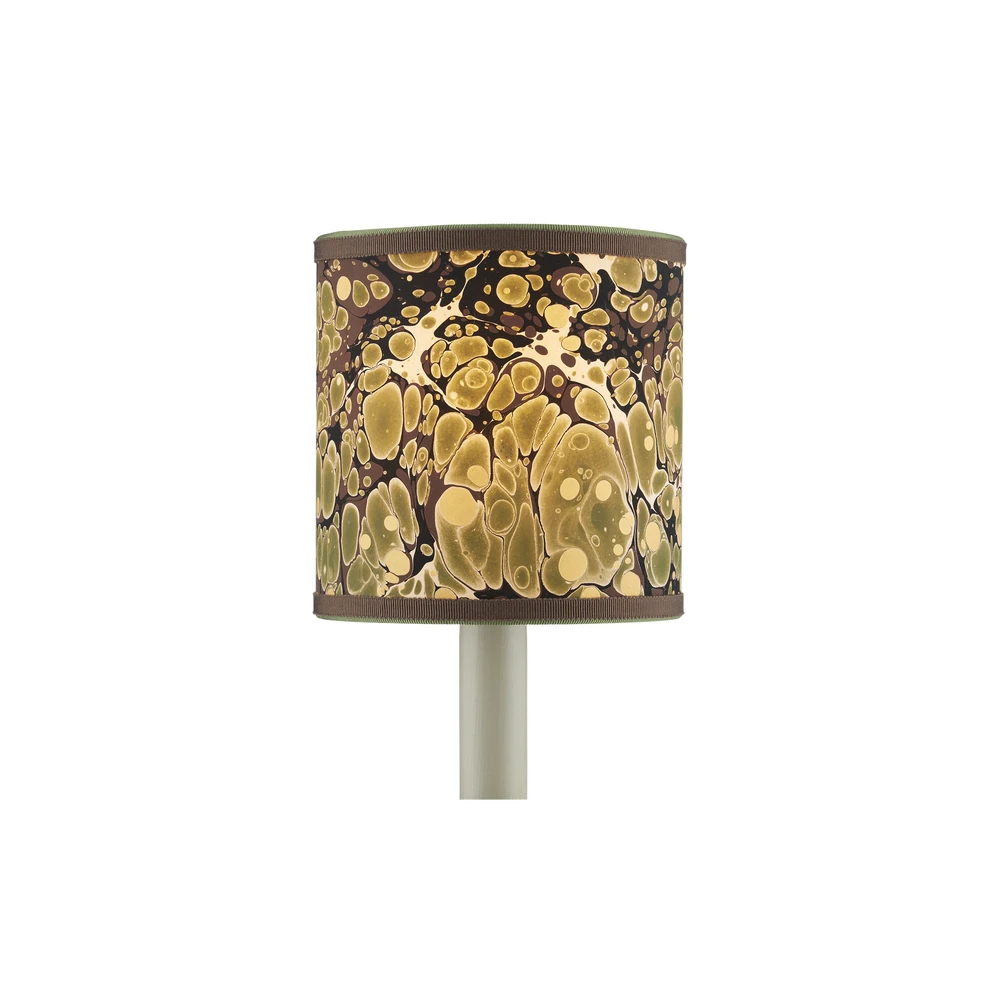 Description: Petite shades are an easy way to bring added style to a space while also introducing color and texture, particularly when they are made from artisanal marbleized paper and ornamented with two layers of grosgrain ribbon in different hues. The saturation of the colors on the handmade tapered and cylindrical shades for chandeliers and wall sconces is achieved by a New England atelier. Patterns will vary because they are created during a very organic process that makes any surface treated to marbleizing so special. There are both vivid and pastel patterns in this collection, as you can see from this green, brown, gold version of the drum shade. Top Diameter: 5″ Bottom Diameter: 5″ Height: 5″