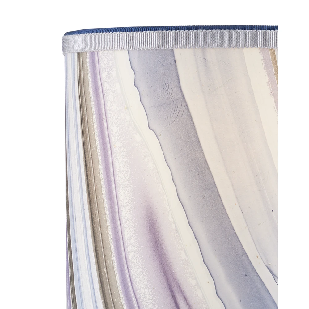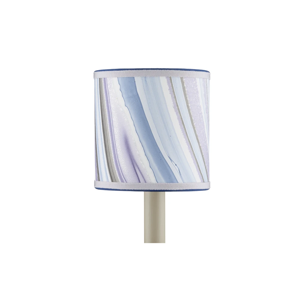 Description: Petite shades are an easy way to bring added style to a space while also introducing color and texture, particularly when they are made from artisanal marbleized paper and ornamented with two layers of grosgrain ribbon in different hues. The saturation of the colors on the handmade tapered and cylindrical shades for chandeliers and wall sconces is achieved by a New England atelier. Patterns will vary because they are created during a very organic process that makes any surface treated to marbleizing so special. There are both vivid and pastel patterns in this collection, as you can see from this lavender agate version of the drum shade. Top Diameter: 5″ Bottom Diameter: 5″ Height: 5″