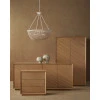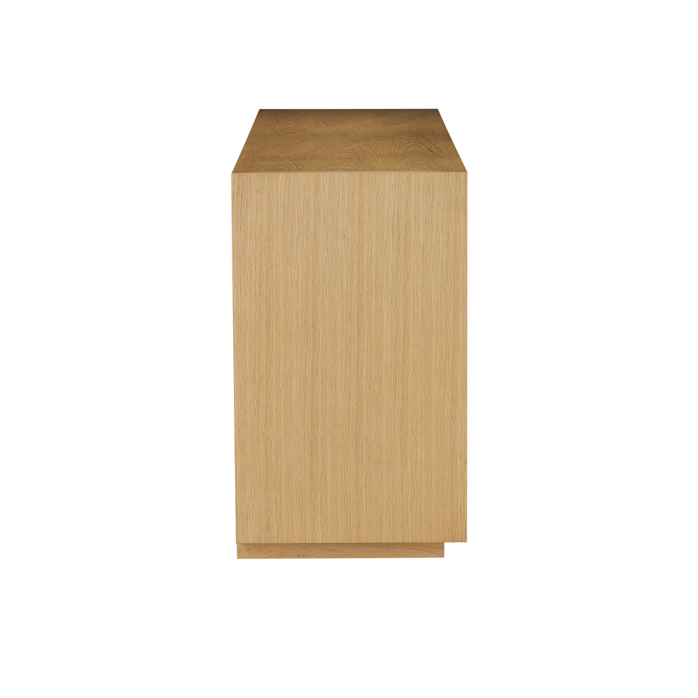 Description: Made of white-oak solids and veneers in a light oak finish, the Margot Natural Oak Credenza was inspired by the casual style of California’s coastal communities. A number of outstanding features include a full chamfered profile edge on the face frame, and a multi-dimensional angled pattern on the doors created with white oak crown veneers. There are generous-sized drawers with beige velvet liners, and the drawers are push to open and close.
