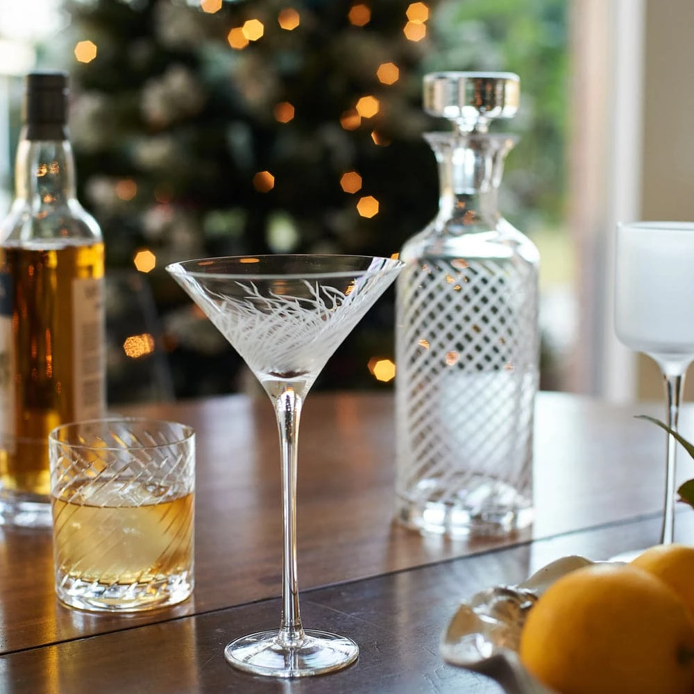 Handmade in Poland, this wonderful martini glass is etched in a grass pattern. Very elegant.
