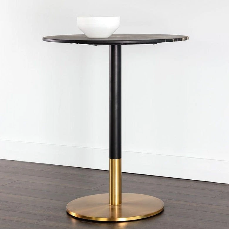 A round bar table from our Ikon collection inspired by Art Deco luxury. Features a matte black marble top with striking gold and white veining and a black and gold steel base. Perfect for small kitchen and dining spaces. As marble is a natural material, unique veining, pitting, fissures, micro-cracks and colour variations are all characteristics that add to the uniqueness and beauty of each piece.