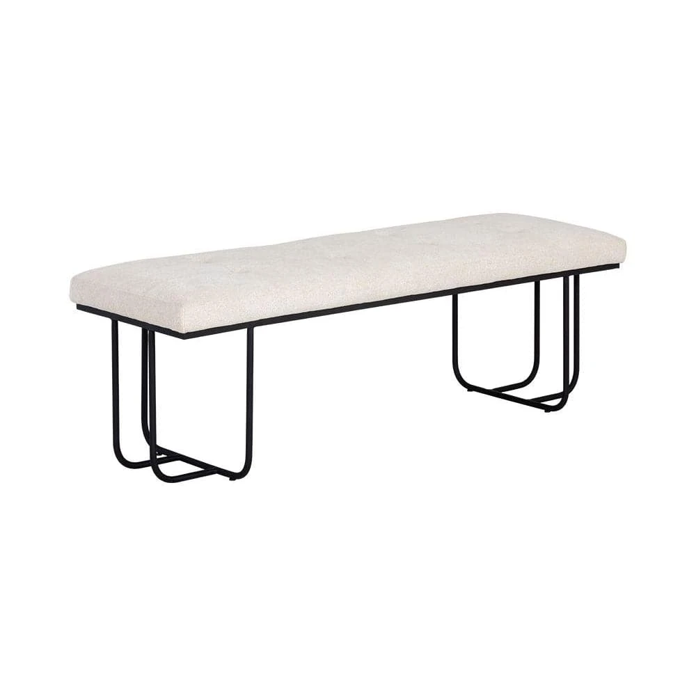 This stylish bench will provide additional seating to living and lounge spaces. Features a tufted seat in clover green and eclipse white fabric with curved black iron legs.