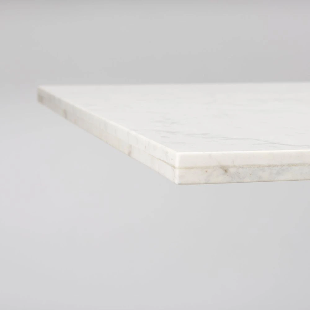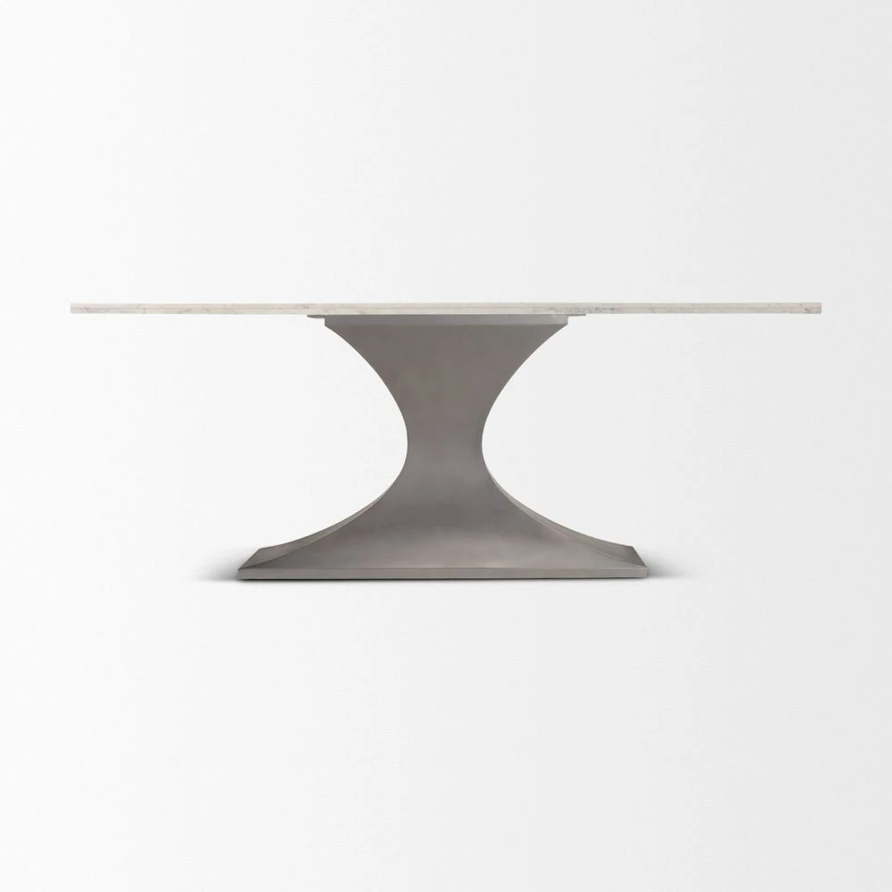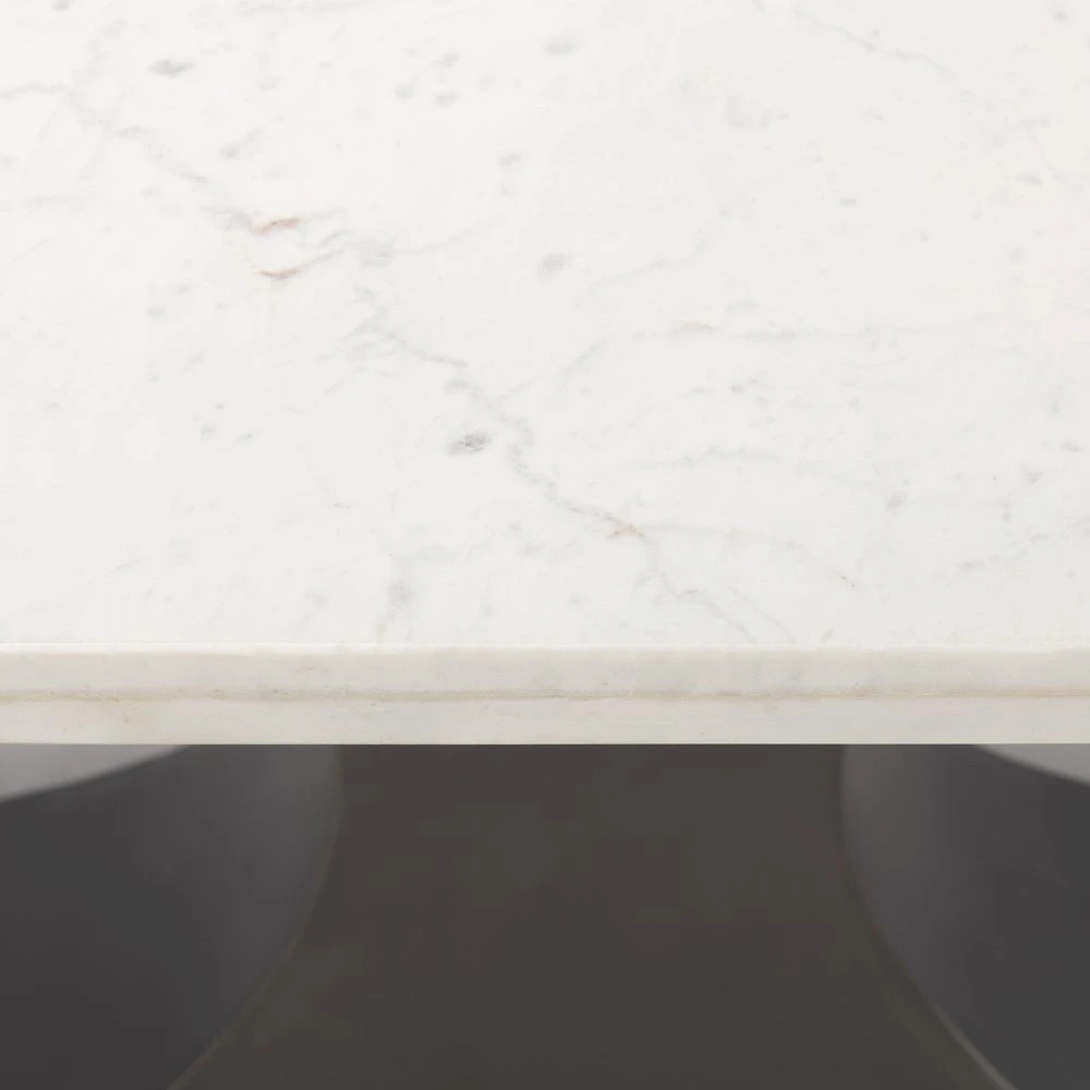 Description: This Maximus pedestal dining table dining table showcases a marble top on a stylized gunmetal base.