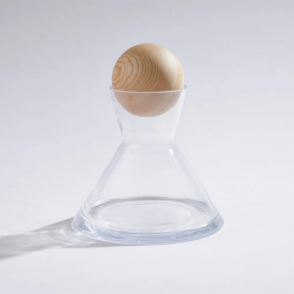 Description: The Maxwell Decanters showcase a contemporary design crafted from hand-blown, mold-formed Portuguese glass and an elegant ashwood sphere stopper in a natural finish. These decanters blend modern aesthetics with functional sophistication, making them a stunning addition to any bar or dining setting.