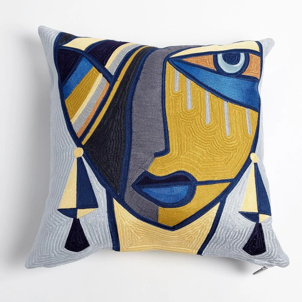 Abstract shapes and a blue and yellow color scheme come together to create our Maya Pillow. The face arrangement was inspired by the brilliant works of Picasso and interpreted in a graphic and colorful way.