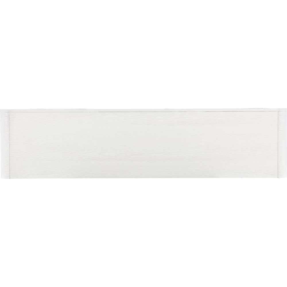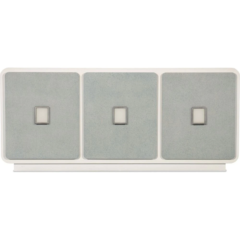 Description: Serene and stylish with a spa-like color scheme, the modern Atlantis Entertainment Credenza has rounded corners on a rectangle shape, raffia-wrapped door fronts and a creamy white plinth base, sides and front. Dramatic square-shaped hardware is silver-colored metal with white painted glass. The three doors have soft-close hinges and magnetic door catches with one adjustable shelf behind each door, a ventilated back panel and a three-plug electrical outlet behind the middle door. The pale blue tone of the raffia-wrapped doors is inspired by Caribbean beaches.