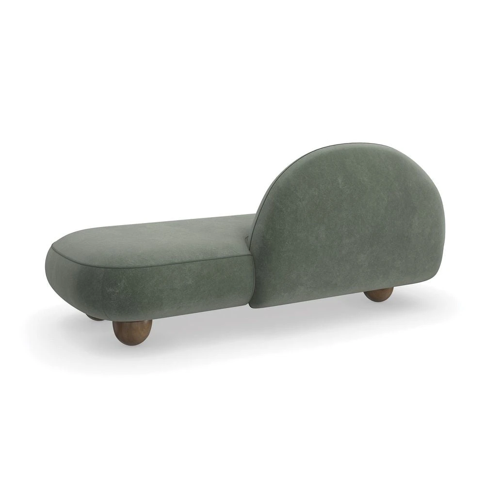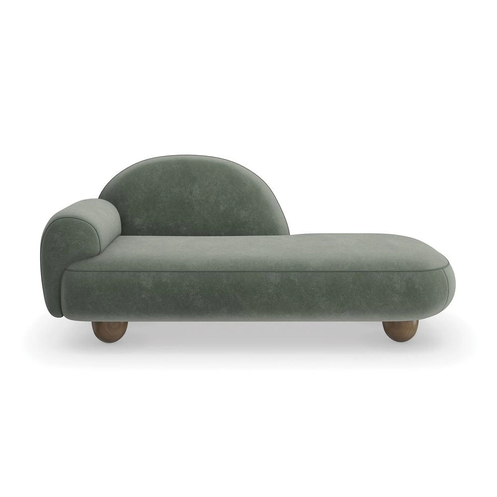 Articulated by simple abstract shapes and a cloud-like silhouette, this Memphis-inspired chaise makes a luxe statement in any interior. Tailored in a plush, mohair-velvet, its rich verdigris hue is warmly complemented by conical wood feet in a Retro Walnut finish. Style solo to create an intimate reading nook, or mix in a seating area for an elevated lounge aesthetic.