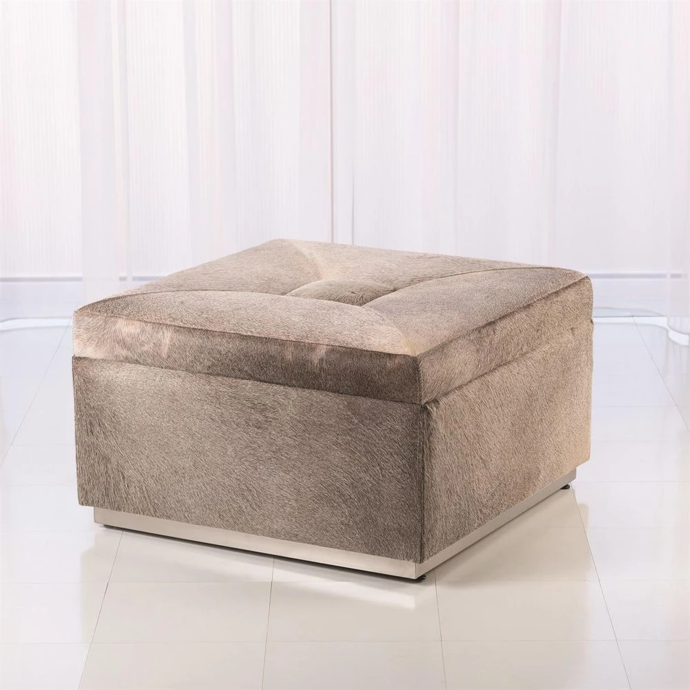 Generous in size and extremely functional with storage on the interior. Covered with grey hair-on-hide and large square bottom in the center of the top. Poly-suede covers the interior of the ottoman.