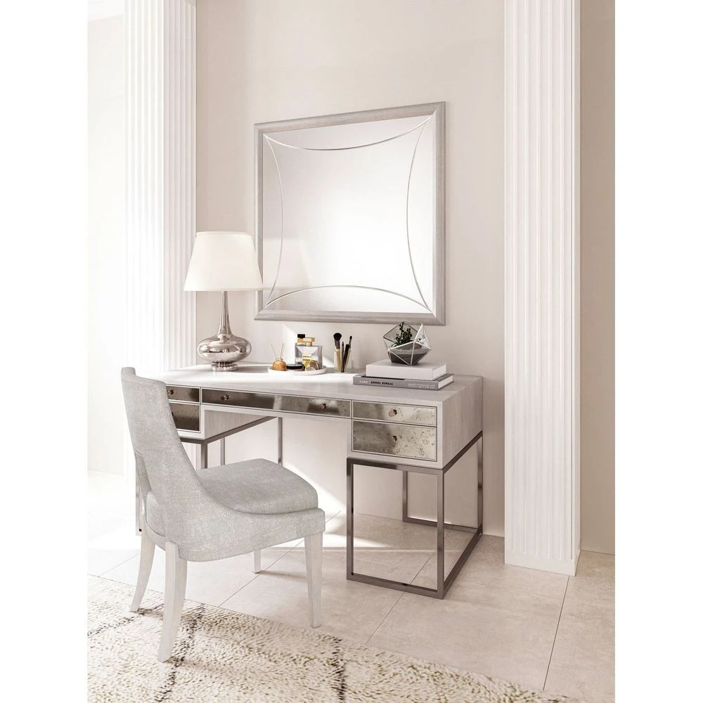 Vintage elegance meets contemporary chic in this attractive writing desk, highlighting the angular geometry and warm antiqued mirror details that are the hallmark of this collection. The desk is veneered in maple with a dove gray finish and rests on an open metal base, with five drawers that provide convenient storage space for all your office essentials. Or showcase this piece in the bedroom to create a glamorous makeup vanity.