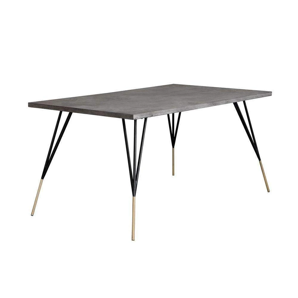 The contrasting materials of this rectangular dining table create a unique industrial modern design. A concrete top is well-supported by thin black metal legs and stylish brushed antique brass feet for an airy appearance. Perfect for smaller urban spaces, with seating up to six. Crafted from a natural concrete mix, each piece will look different, with variations of grey hues that will enhance over time.