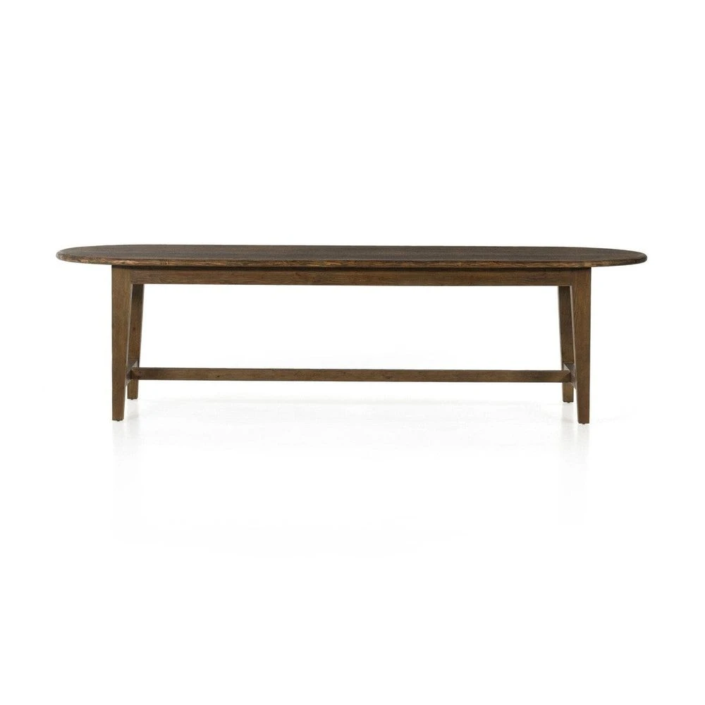 - Description: Made from solid pine that’s been weathered for a distressed, farmhouse-style look then finished in a warm honey. Simple tapered legs support an oval top with a stretcher and apron for a beautifully traditional look. Seats 10 comfortably.