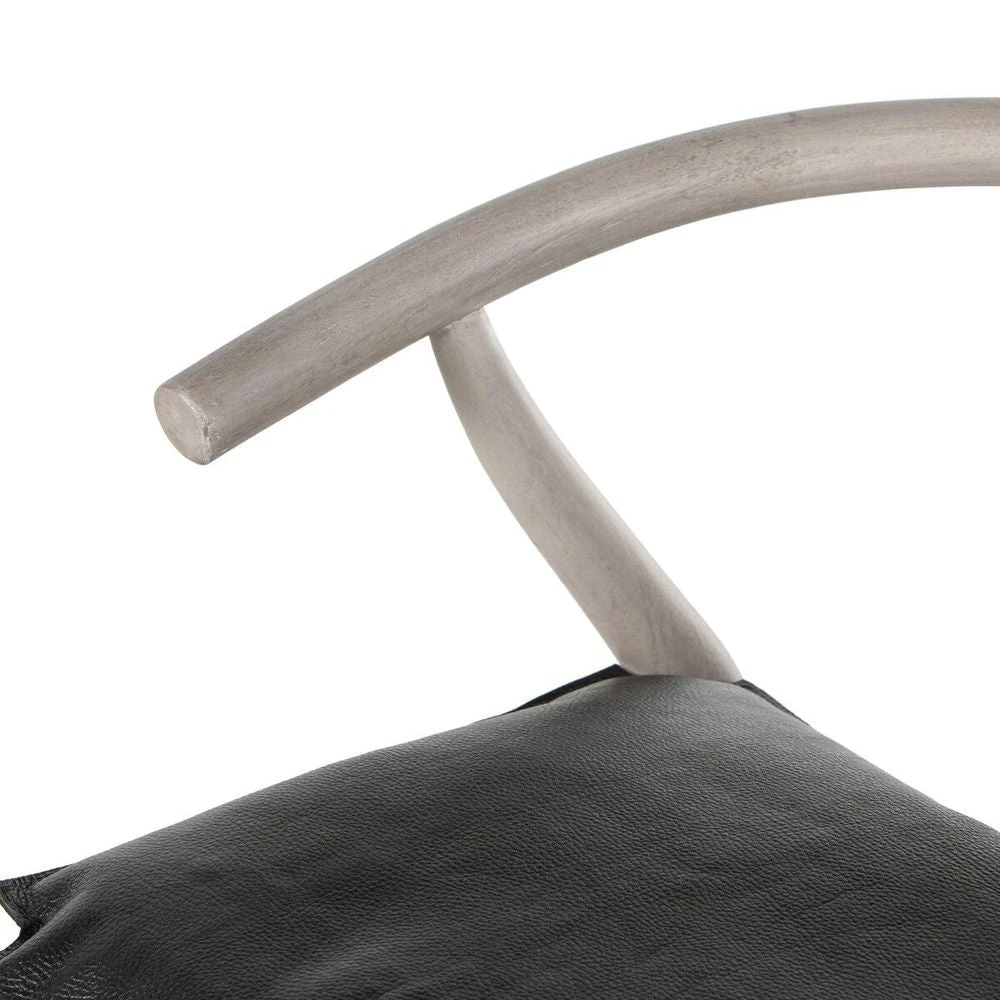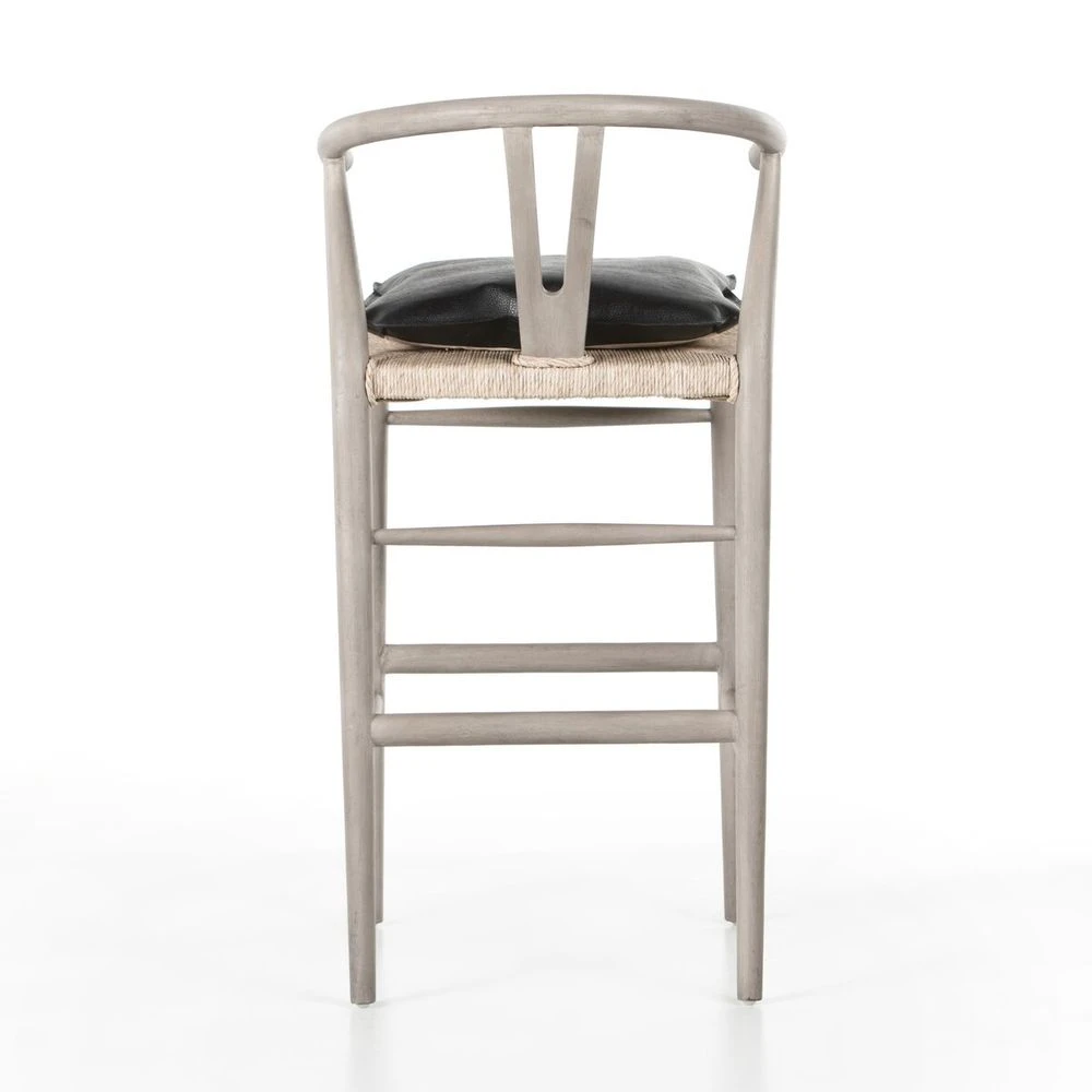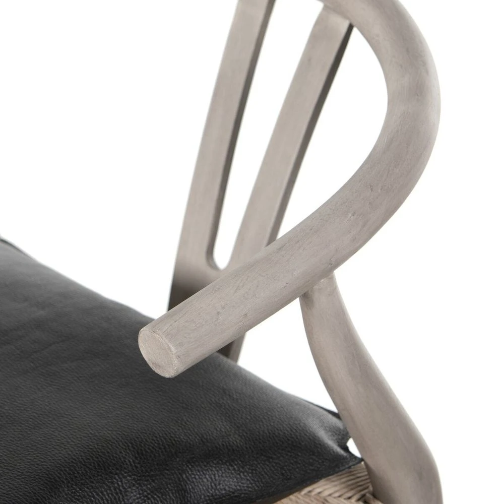 Modern curves redefine the classic wishbone-style bar stool. Vintage white all-weather wicker is woven for a dose of texture within weathered grey teak framing. Complete the look with a cushion upholstered in black top-grain leather. Cover or store indoors during inclement weather and when not in use.