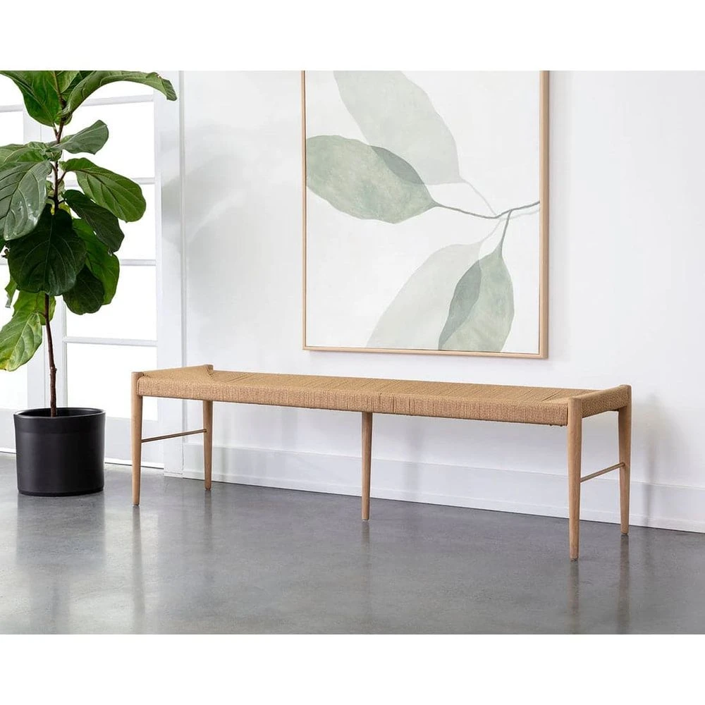 The Moira bench brings together a sleek modern silhouette with a coastal look. Features sturdy seating made from natural paper rope and a white wash oak frame. Brass painted stretcher bars complete the design. As wood is an organic, porous material, these pieces will contain natural variation of texture and may also exhibit fine indentations and cracks. Wood pieces will also display a disparity of colour and grain, and visible knots and burls that add to the character of each piece. Due to the natural contents of natural paper rope, it is advised to minimize contact with strongly dyed fabrics to avoid discolouration and/or colour transfer.