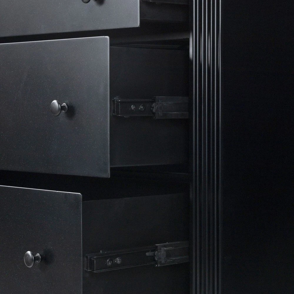 Description: This French-inspired full-on metal dresser features turned leg detailing, classic moulding along the edges and an ogee edging on top. Drawers open and close on smooth side-mount metal glides. Crafted from iron in a matte black.