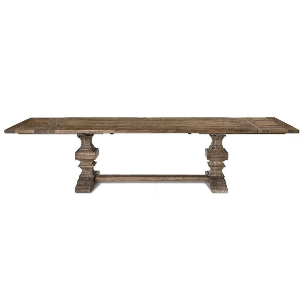 Made of 100% recycled pine, this grand farmhouse table features a slatted top finished with breadboard ends, atop carved balusters, distressed and rubbed with a warm honey stain. A subtle gray wash is applied to rest in the cracks and natural recesses. Includes two 18 inch leaves that can be removed to create a 96″ table. Solid wood will continue to move with temperature and humidity changes, which can result in small cracks and uneven surfaces, adding to its authenticity and character.