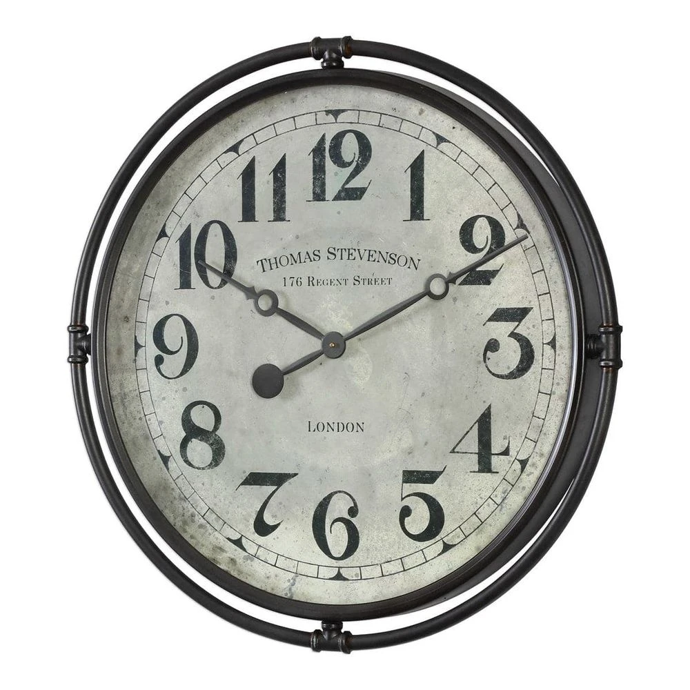 Smoke Gray Industrial Iron Frame With An Aged Ivory Clock Face Under Glass. Quartz Movement Ensures Accurate Timekeeping. Requires One “AA” Battery.