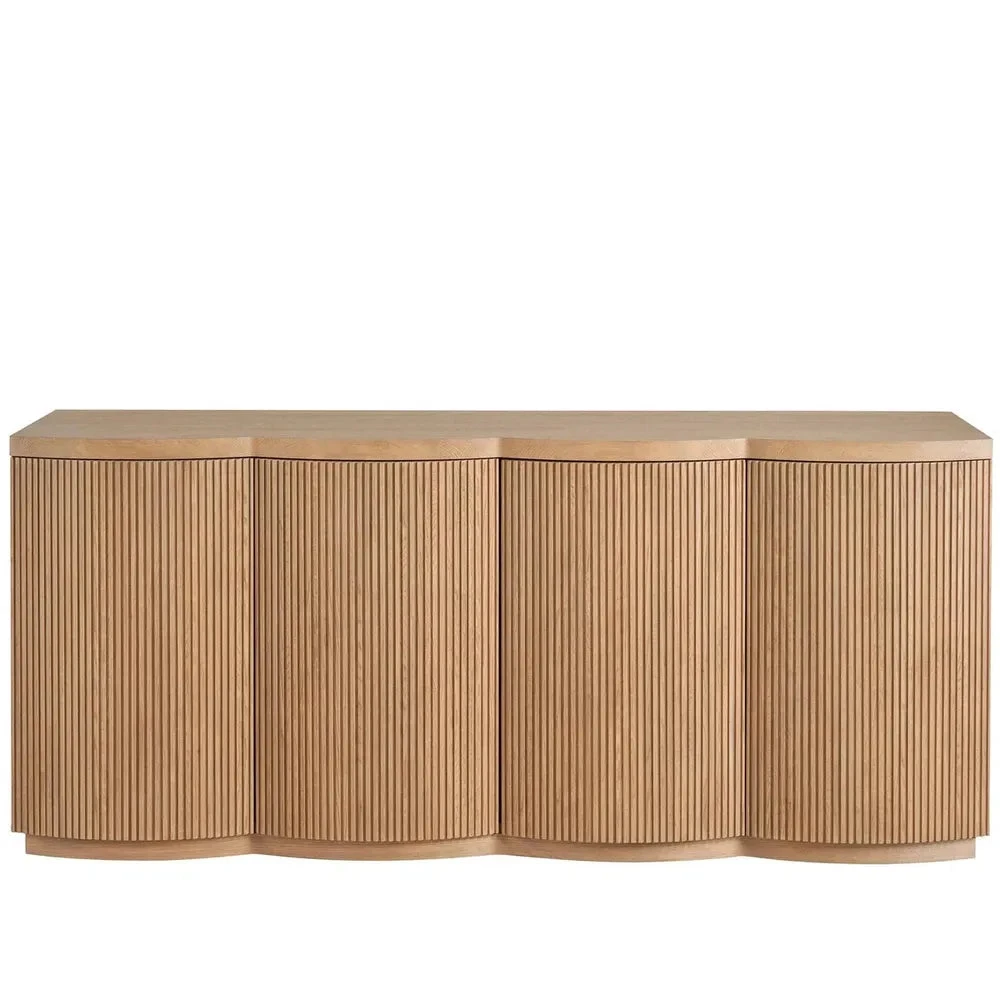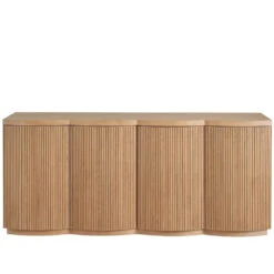 The Lumi Credenza stands out with its four tambour-wrapped doors, featuring touch latches for a sleek, hardware-free appearance. The entire body is adorned with delicate vertical ridging, adding a layer of depth and visual appeal to the piece. This design choice enhances the credenza’s overall aesthetic, infusing spaces with a refined texture and a modern, sophisticated charm