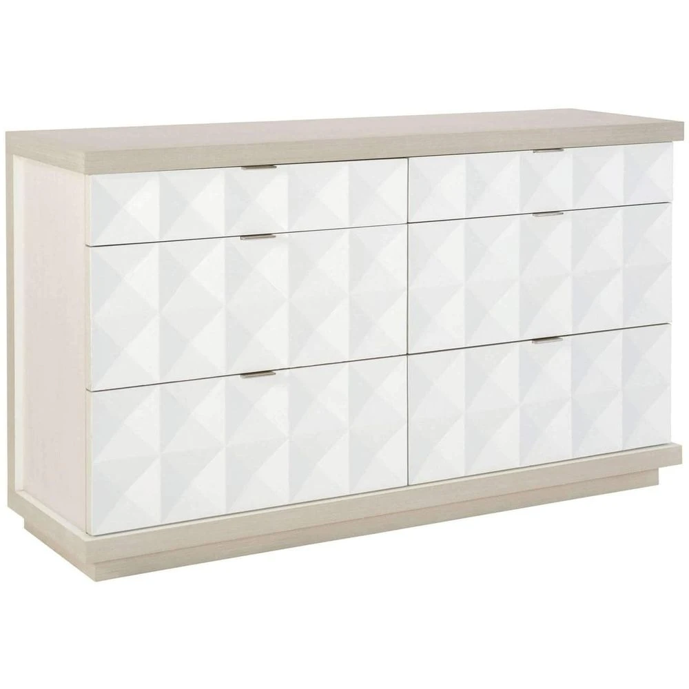 - Six drawers with cast shaped overlays on drawer fronts in White Linen finish