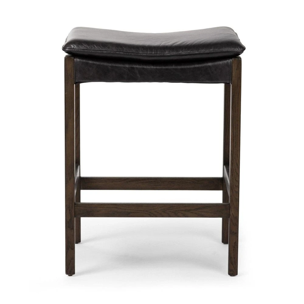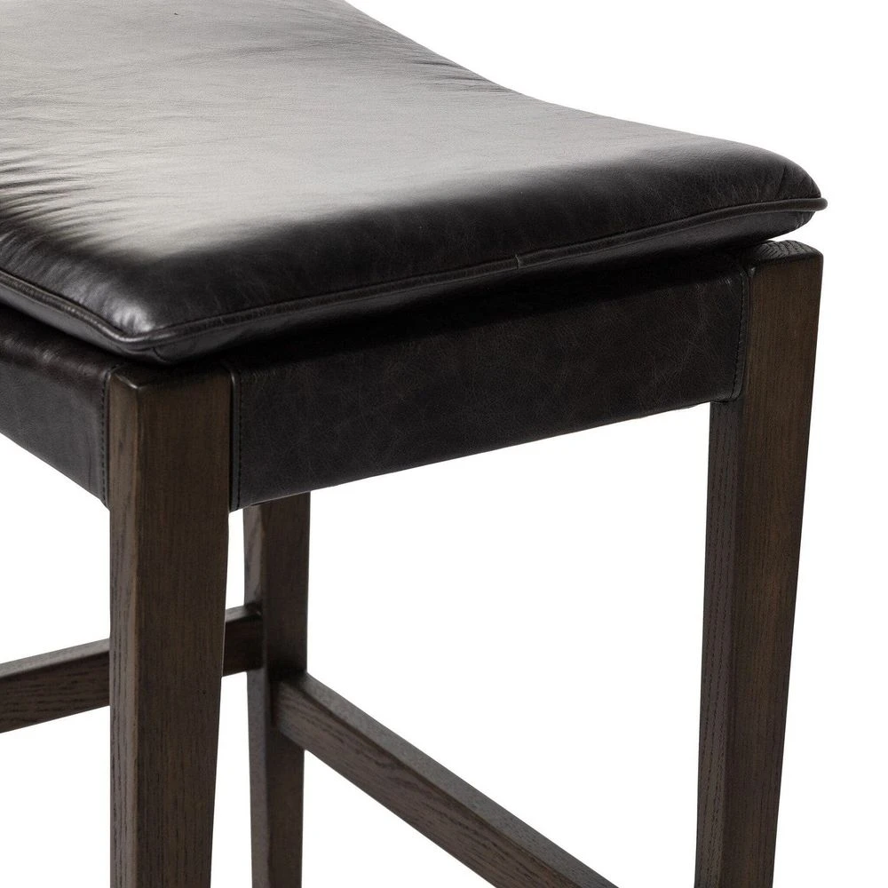 Description: Modern and transitional, solid burnt oak pairs with black top-grain leather exclusive to Four Hands. Perfectly sized for the counter.