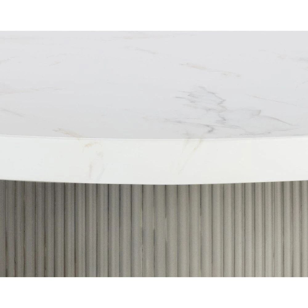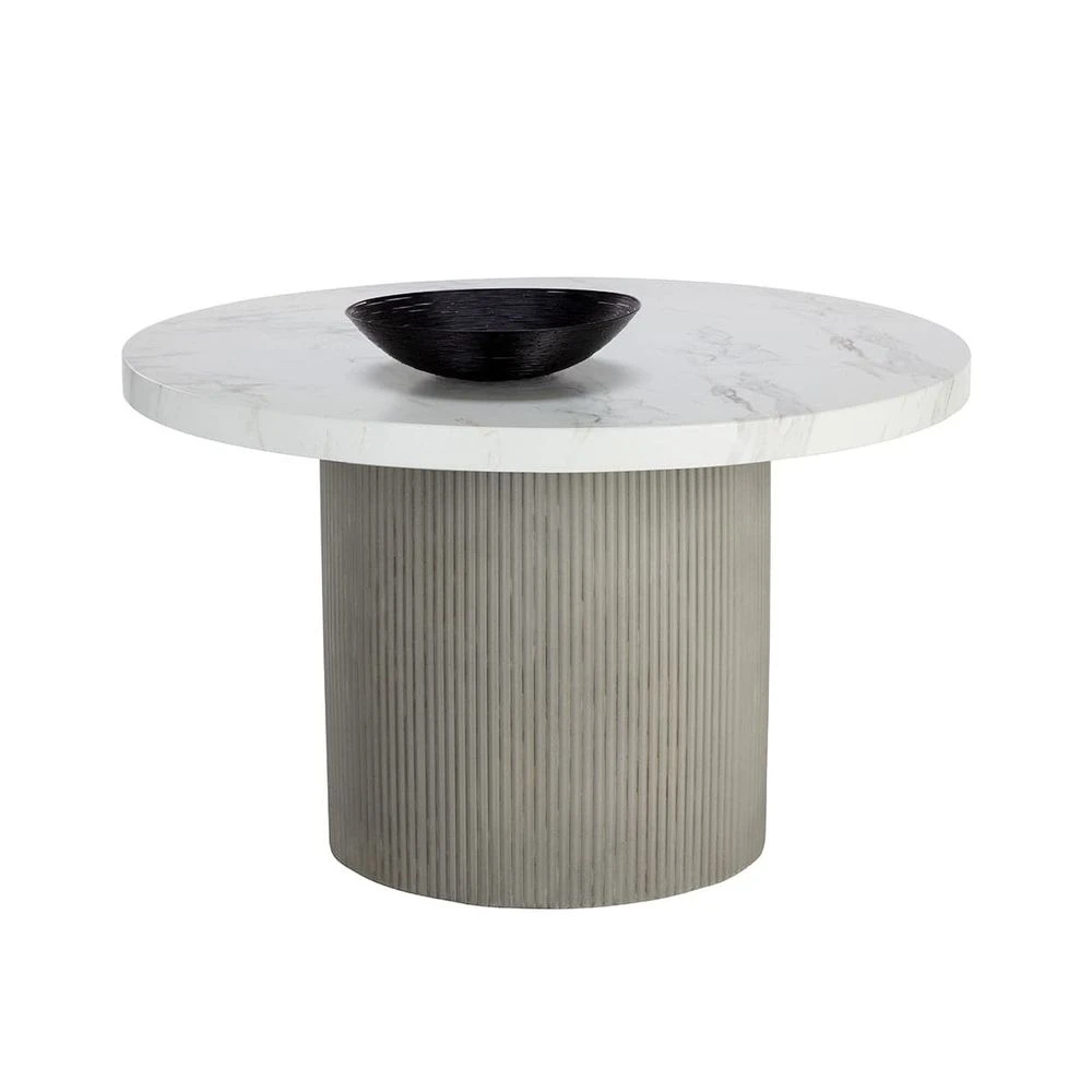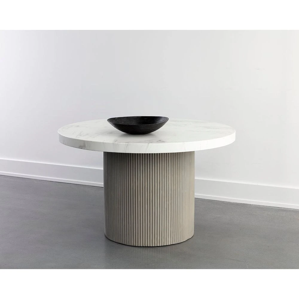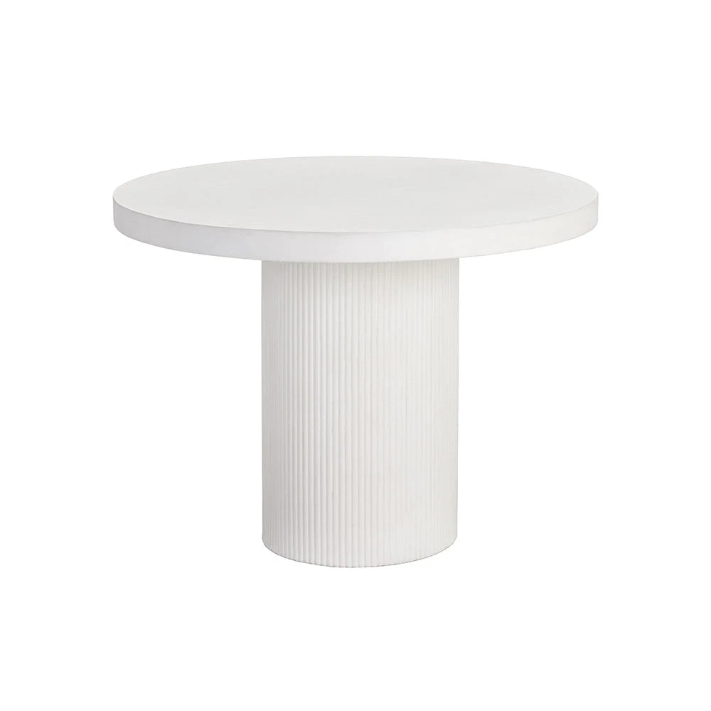 A round, contemporary 40″ dining table that features a clean and refined design. Crafted from light grey concrete with a stylish fluted table base. Also stocked in ivory concrete. 55″ size also available. Suitable for indoor and covered outdoor spaces.
