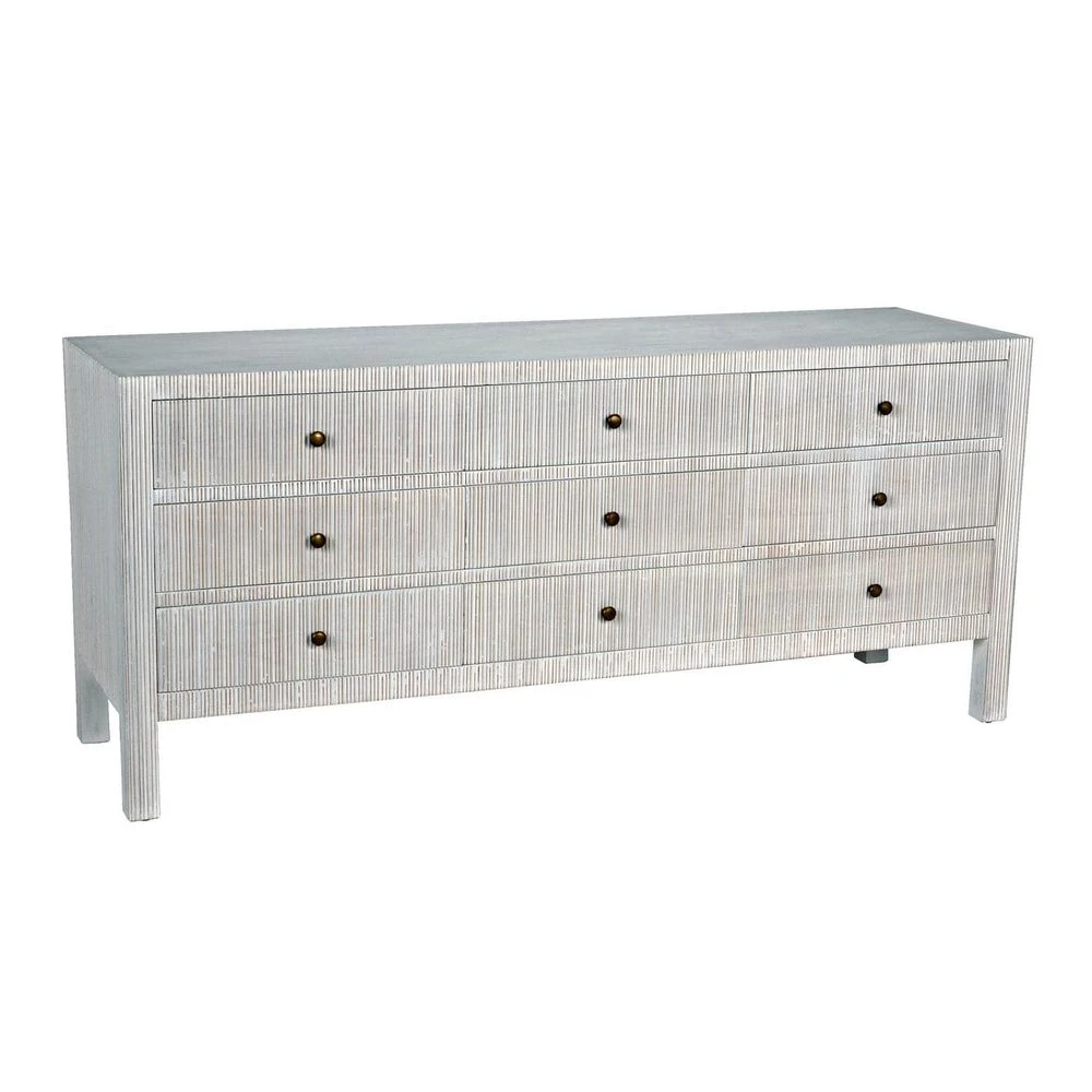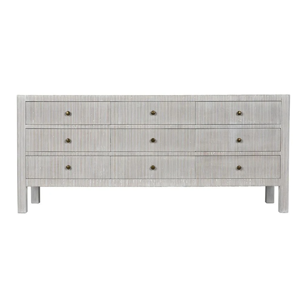 Our nine-drawer Conrad Dresser features a delicate, hand-carved ribbing on three sides accentuating White Wash finish allowing a subtle reveal of the golden wood-tone beneath. Antique brass knobs.