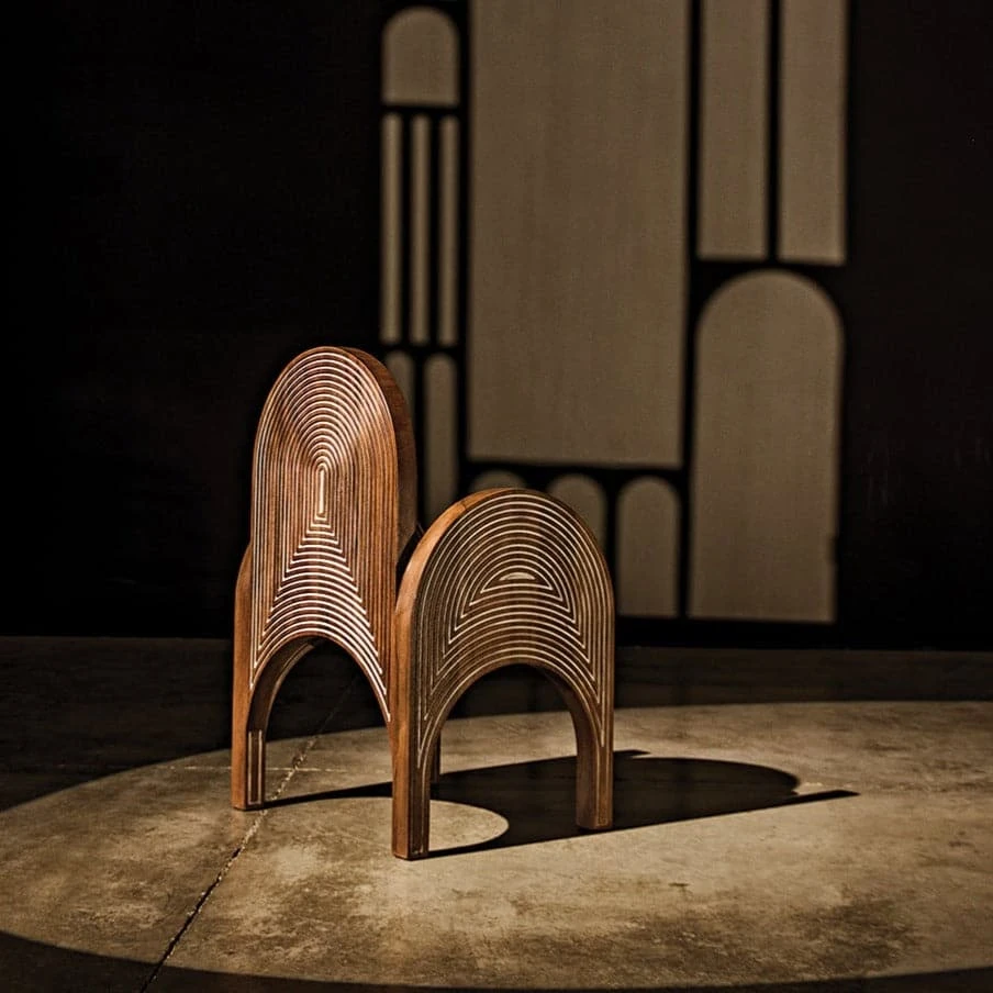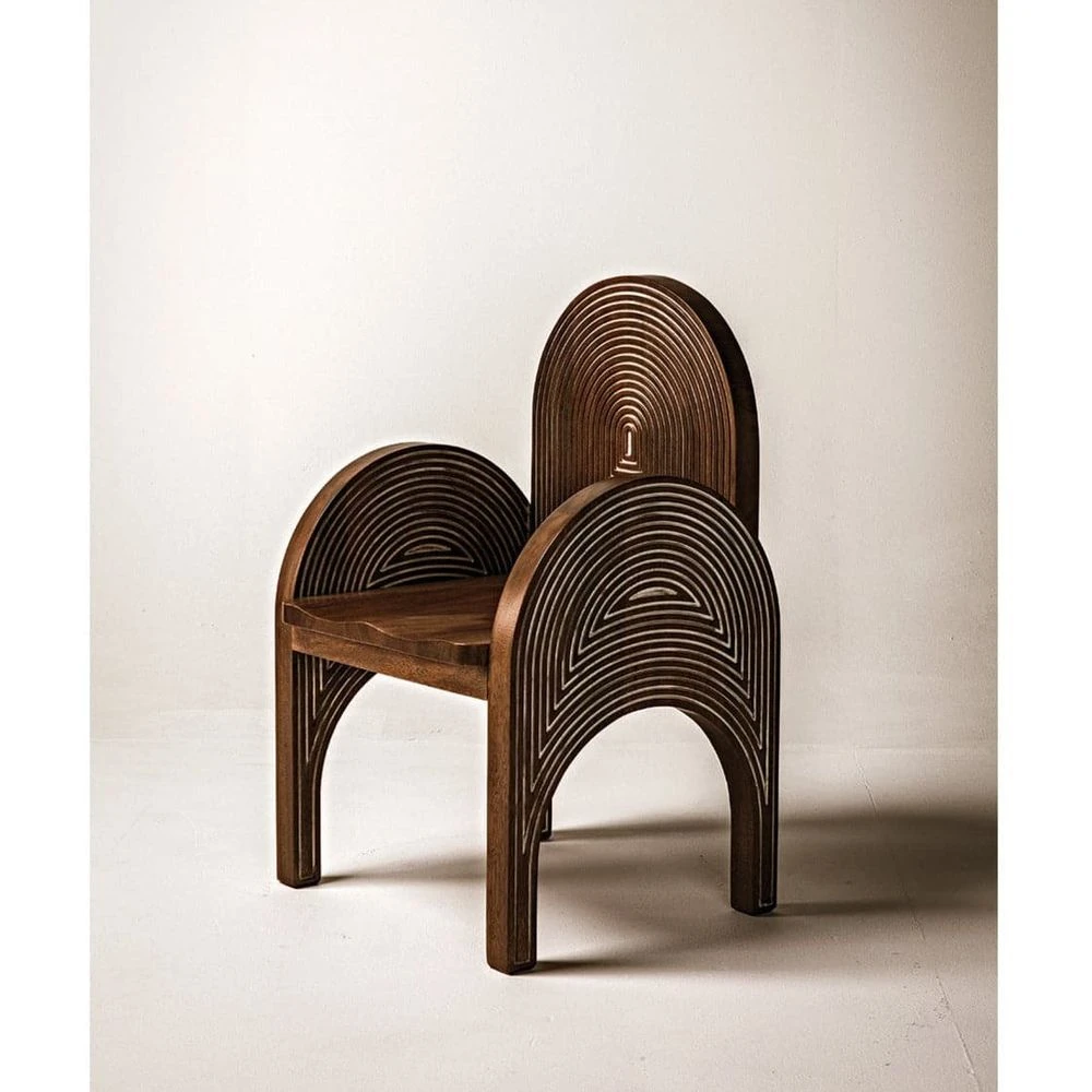 A unique statement chair in hand-carved walnut features arcing back and armrests with a graded arch design on each plane of the chair. Arch reliefs are highlighted in white for a graphic emphasis.