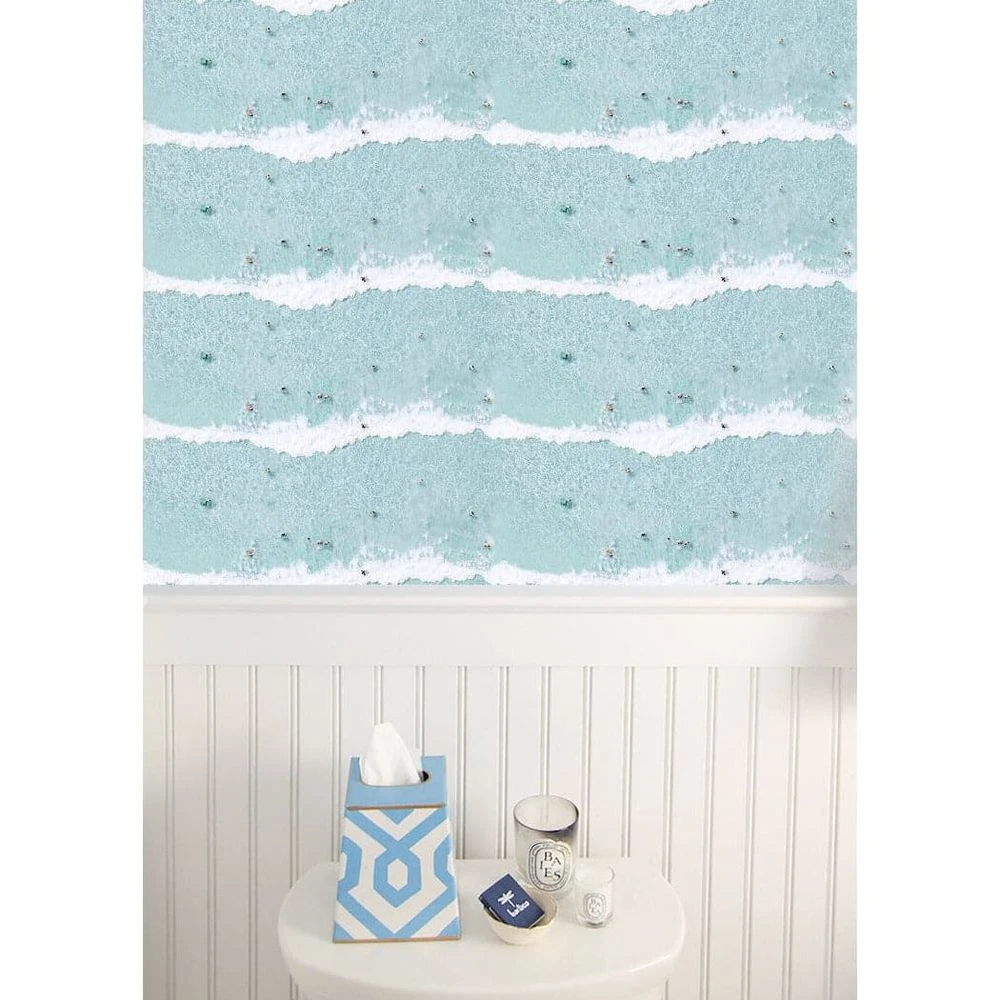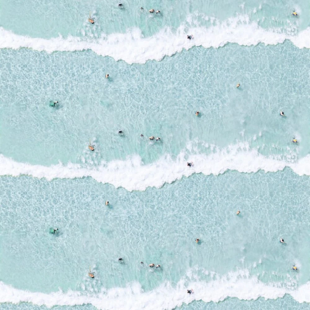 Cascading pastel blue ocean waves dotted with scattered bodysurfers form the Ocean Swimmers pattern, photographed over the stunning waters of Hawaii.Featuring four of Malin’s aerial photography images, the collection draws inspiration from coastal images ranging from the Australian coast to the Italian Riviera.