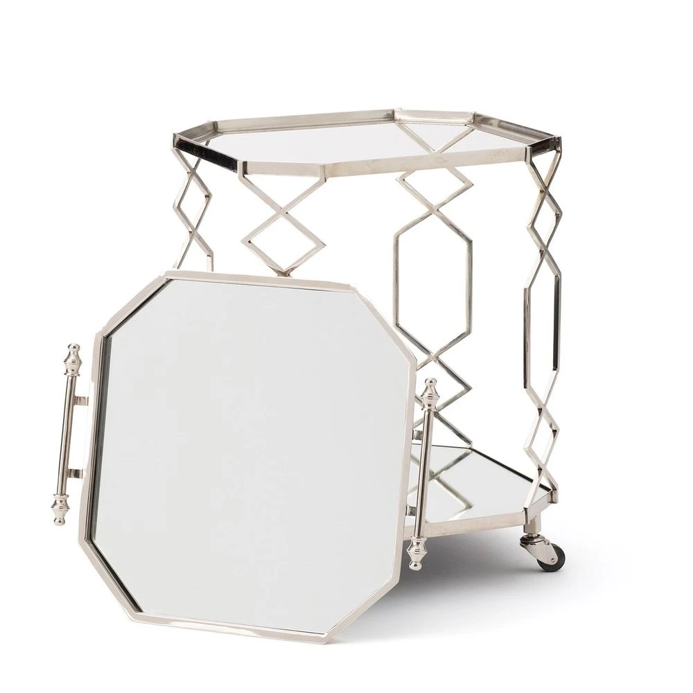Description: Multitasking at its best! Our versatile Rectangular Trolley can be used as an occasional side table, serving cart and all around functional piece. The top tray is removable and the mirrored tray surface provides easy clean up. The trolley is finished in polished nickel with rolling casters for ease of movement.
